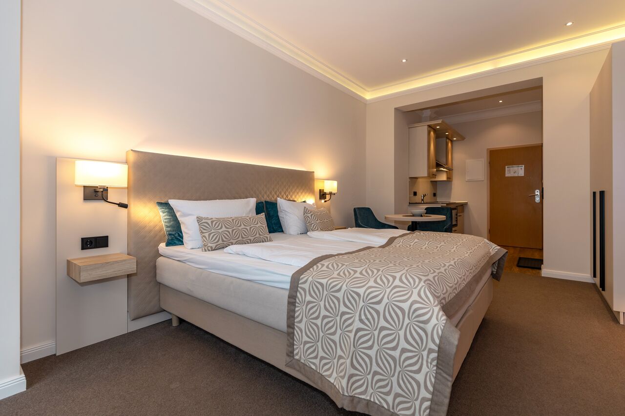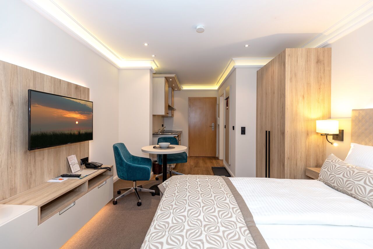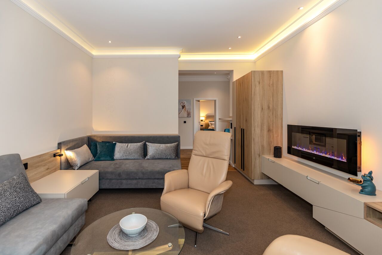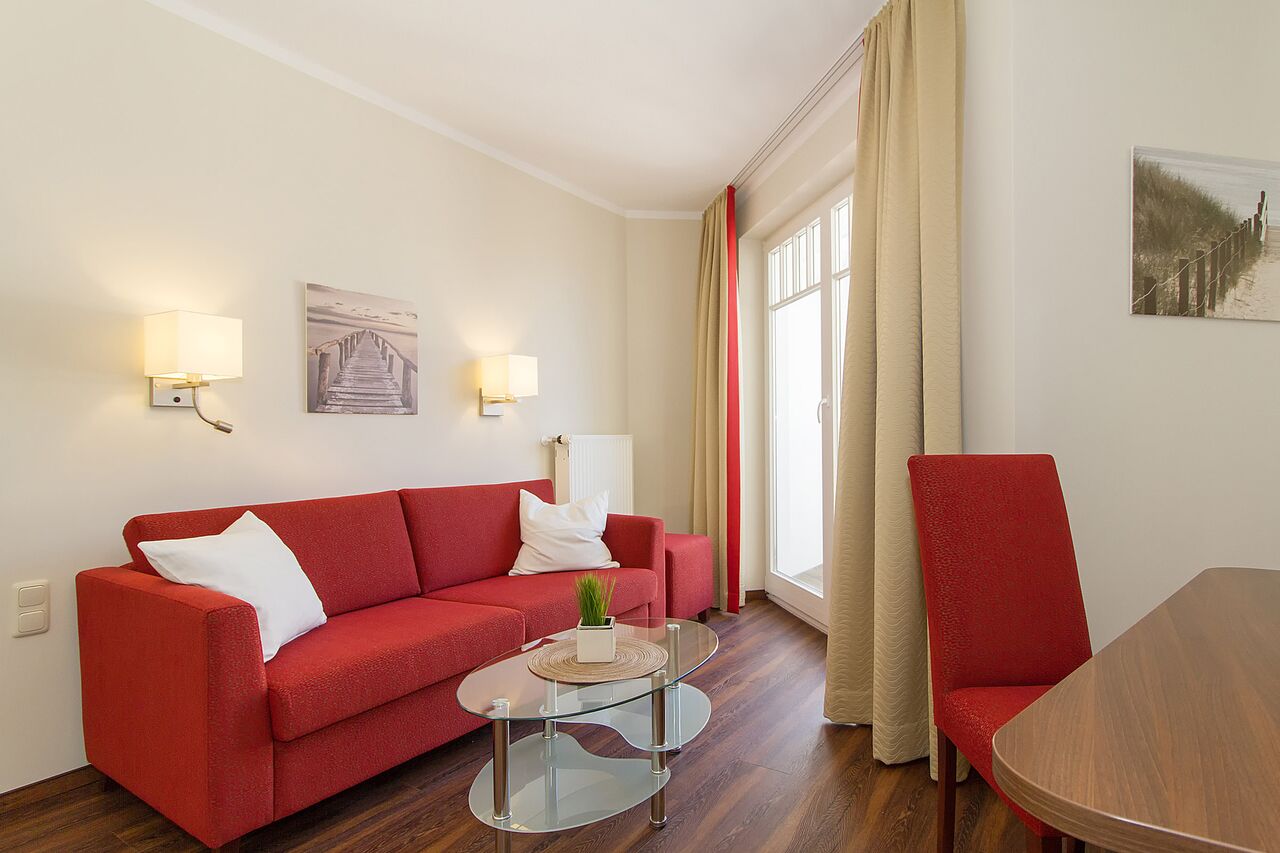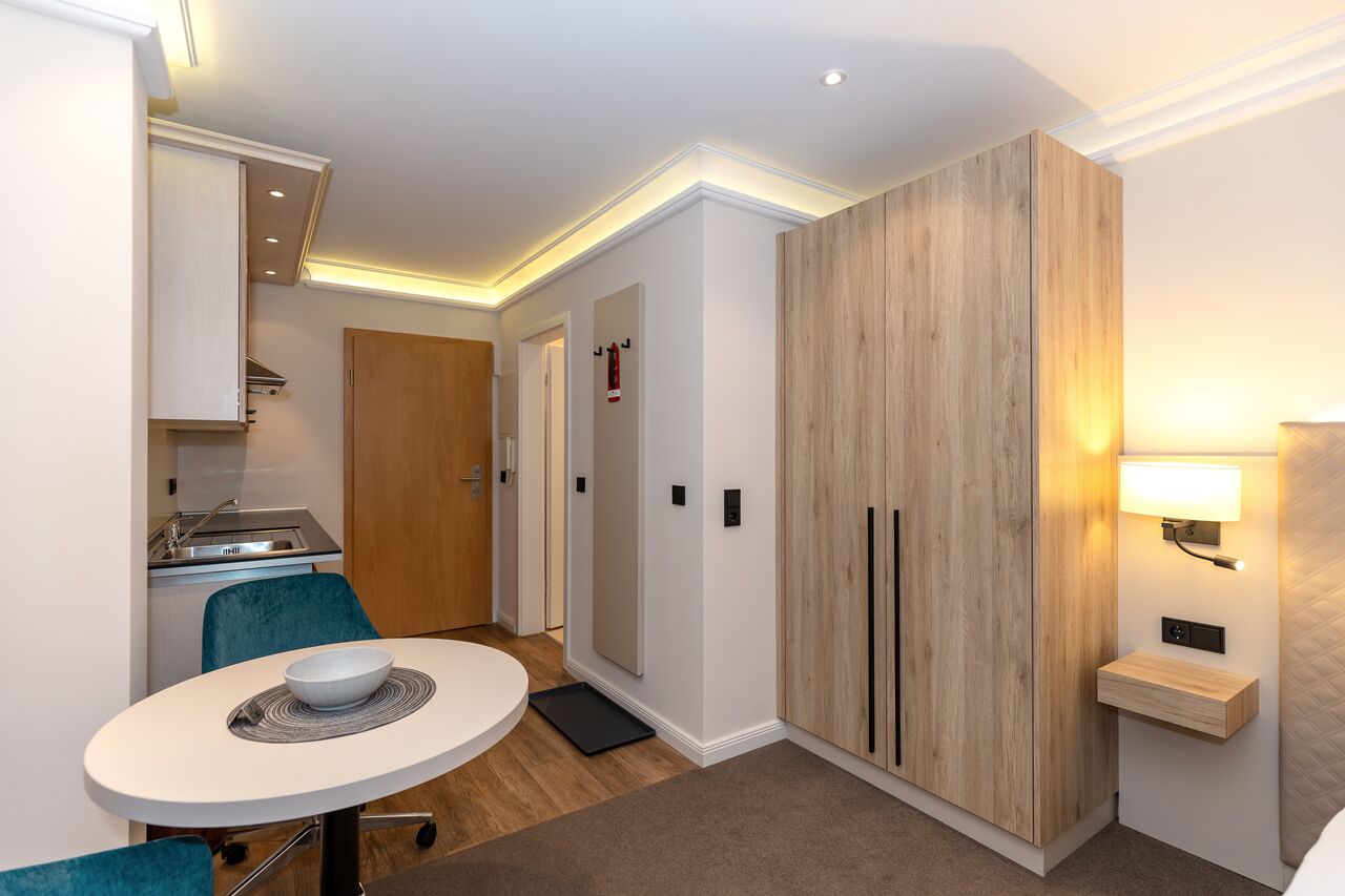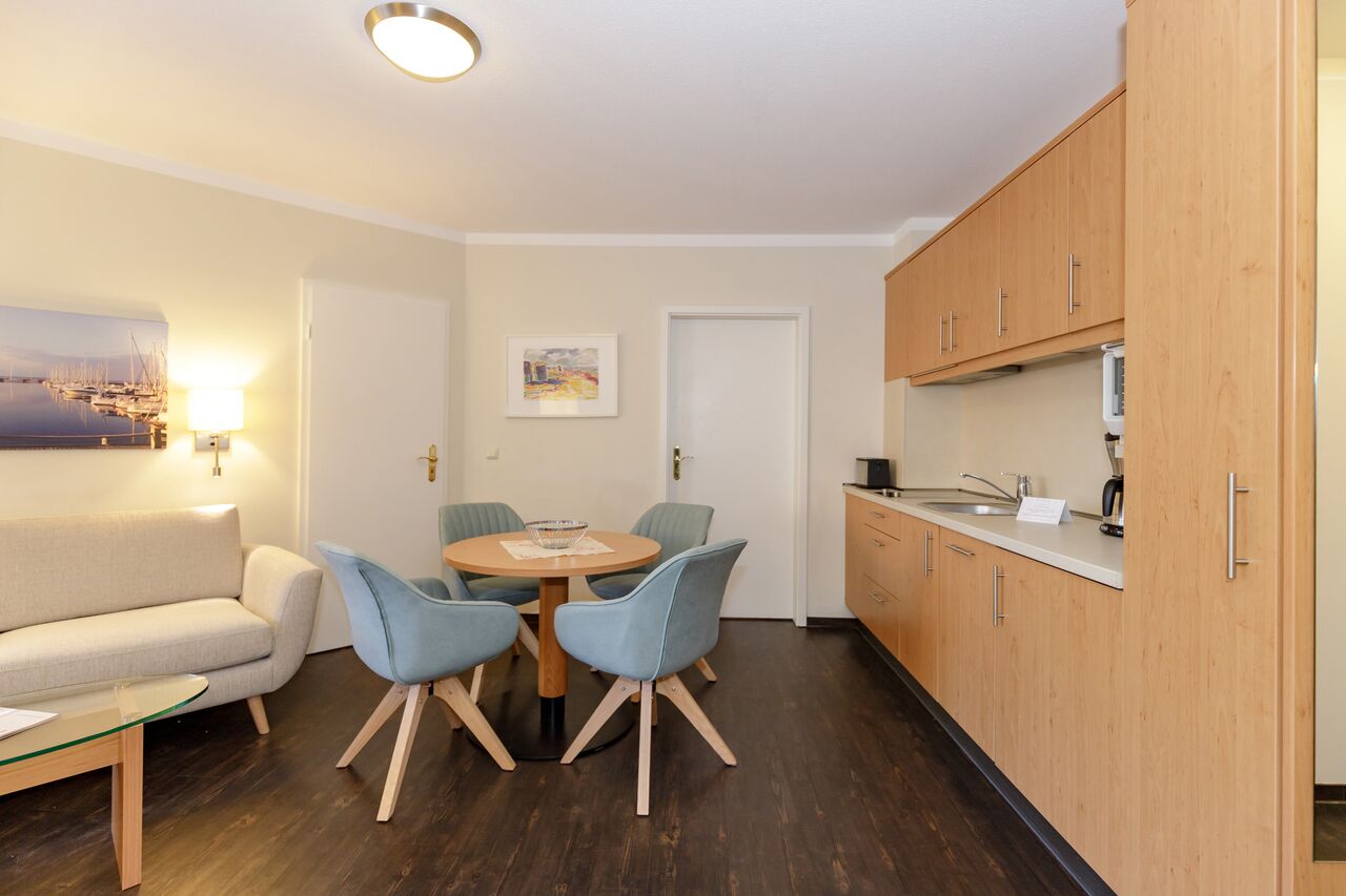 Unsere 1- und 2-Raum-Appartements verbinden die Unabhängigkeit einer Ferienwohnung mit dem Komfort eines Hotels: großzügiger Wohnraum, Küchenzeile mit Esstisch, Flachbildfernseher, Safe, Telefon, tägliche Reinigung und Frühstück im benachbarten Hotel inklusive.