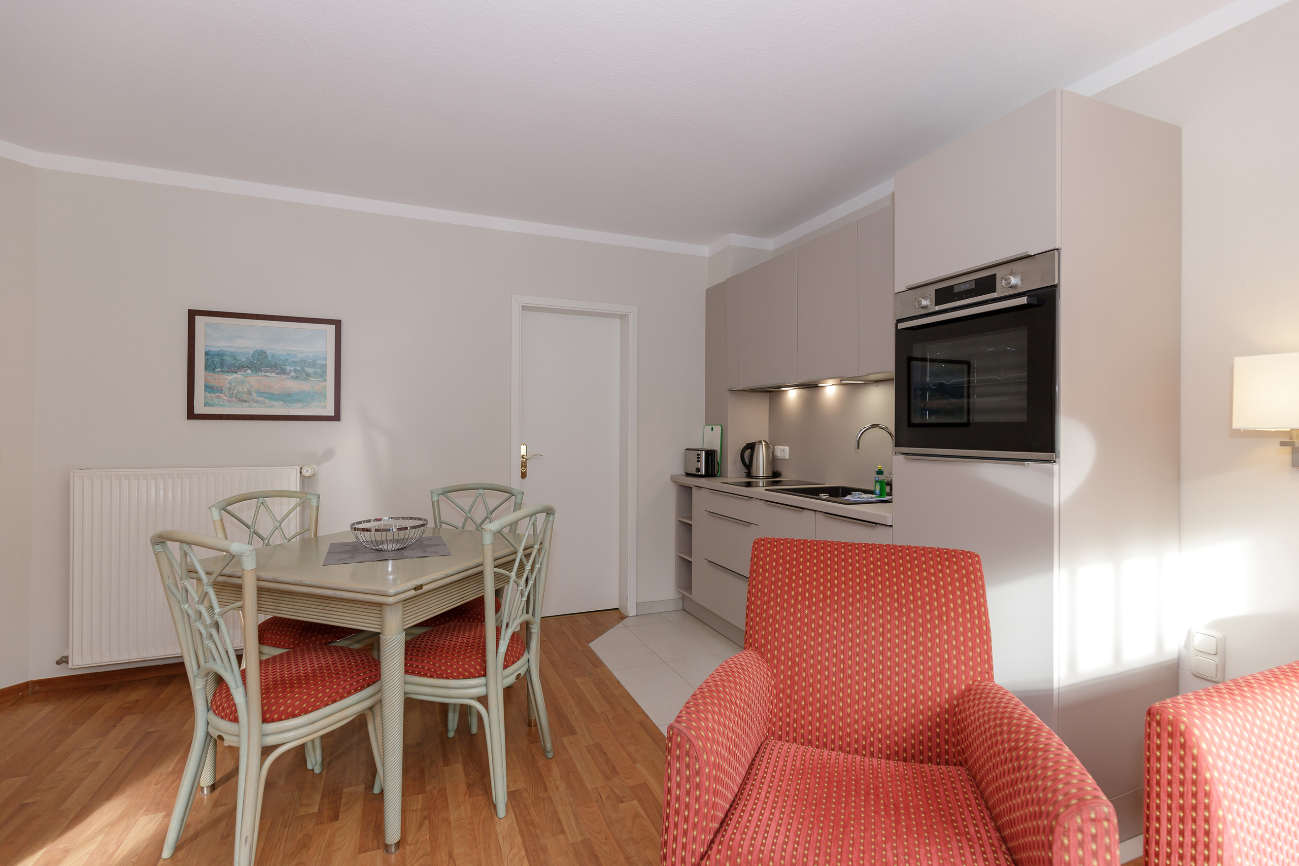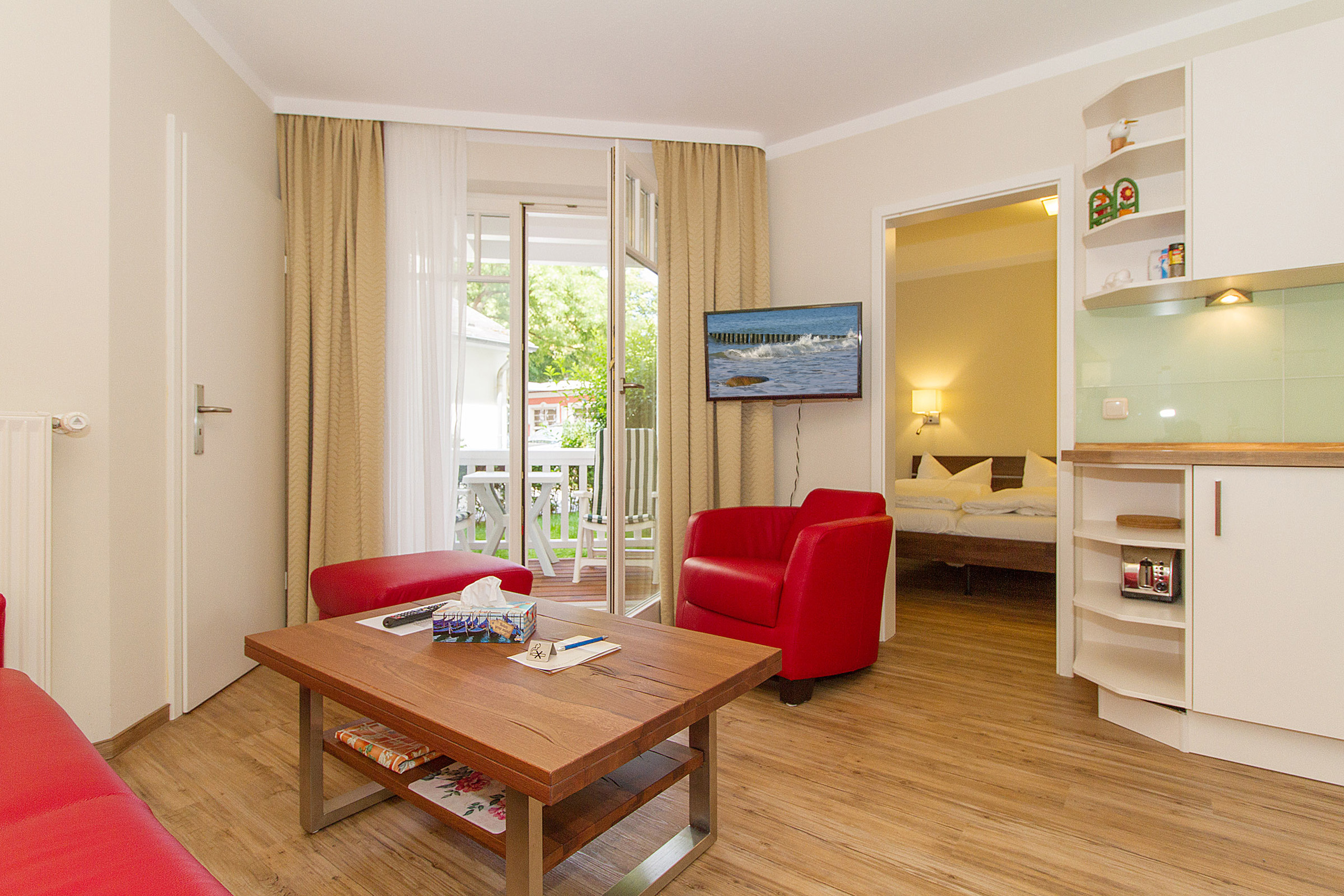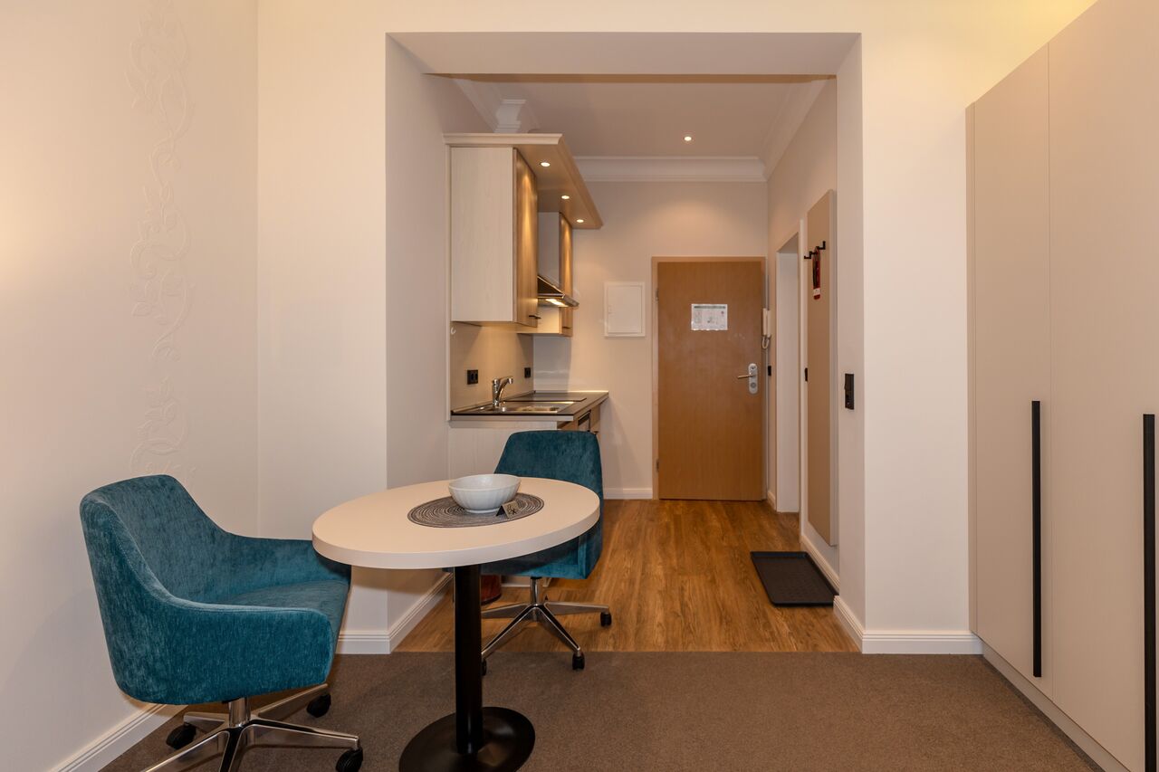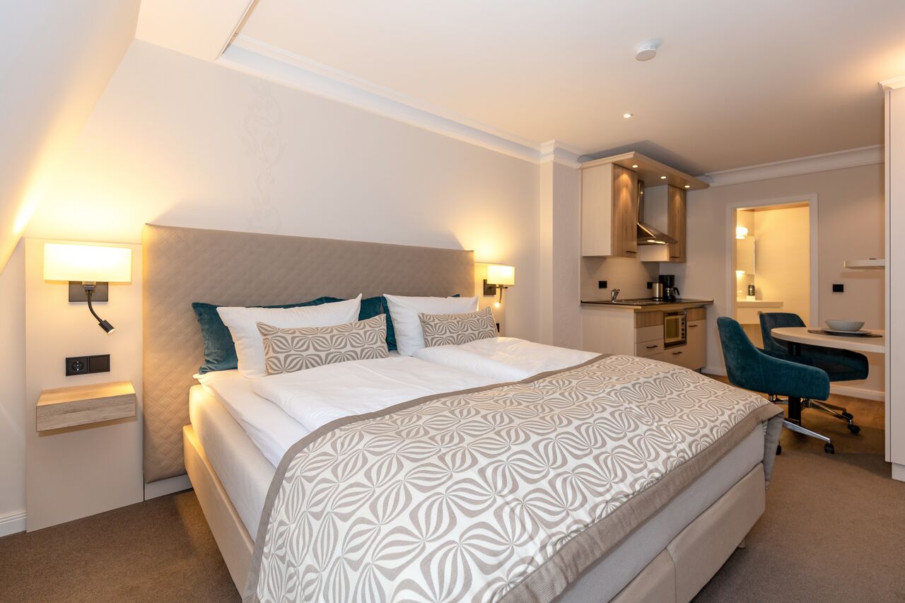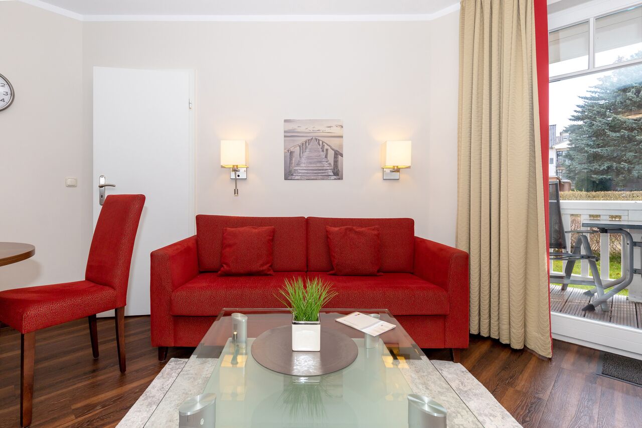 Unsere 1- und 2-Raum-Appartements verbinden die Unabhängigkeit einer Ferienwohnung mit dem Komfort eines Hotels: großzügiger Wohnraum, Küchenzeile mit Esstisch, Flachbildfernseher, Safe, Telefon, tägliche Reinigung und Frühstück im benachbarten Hotel inklusive.