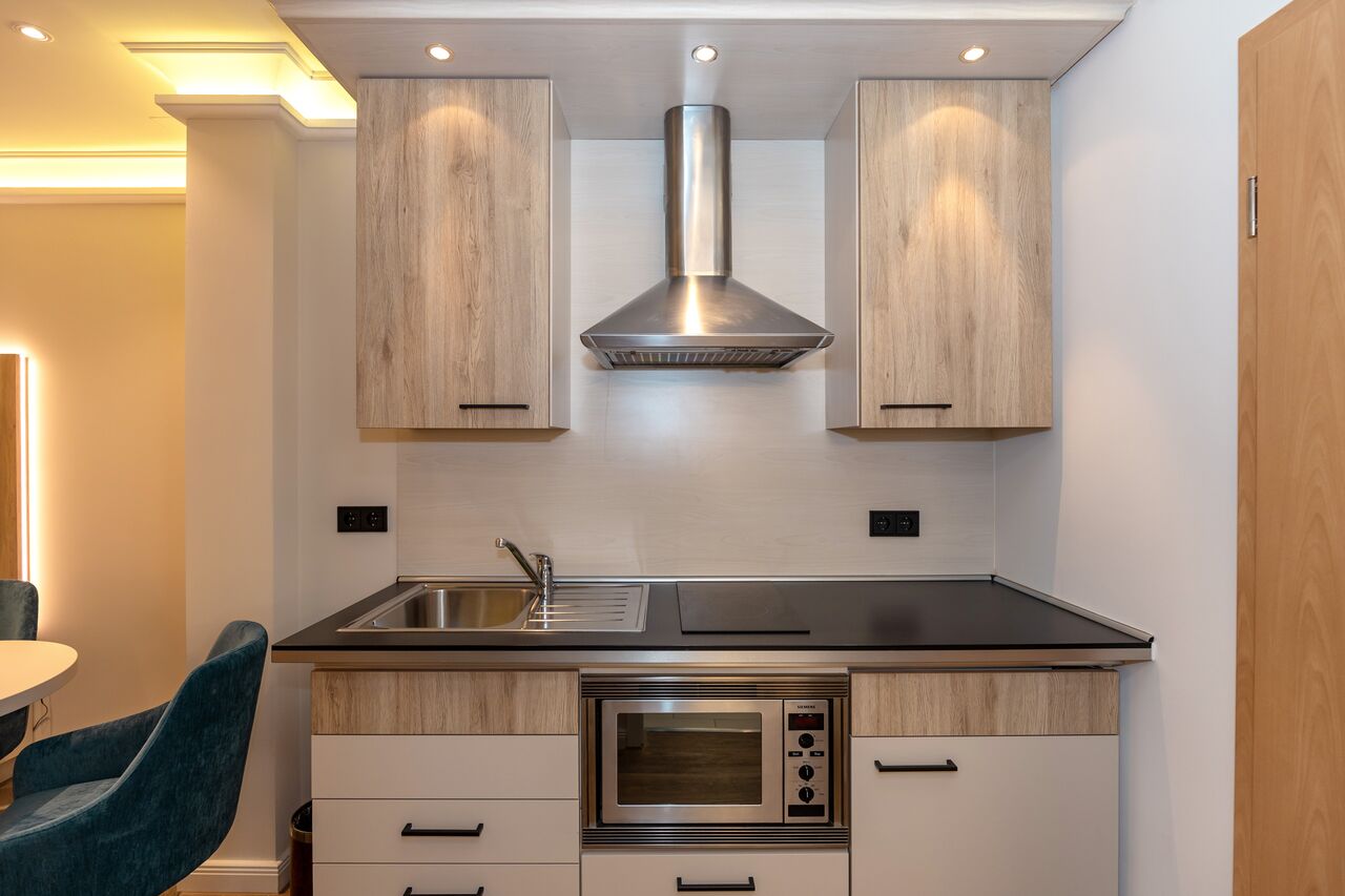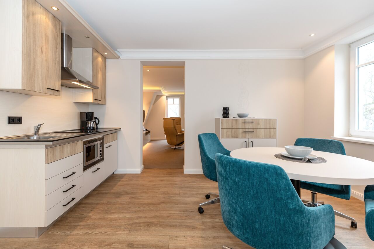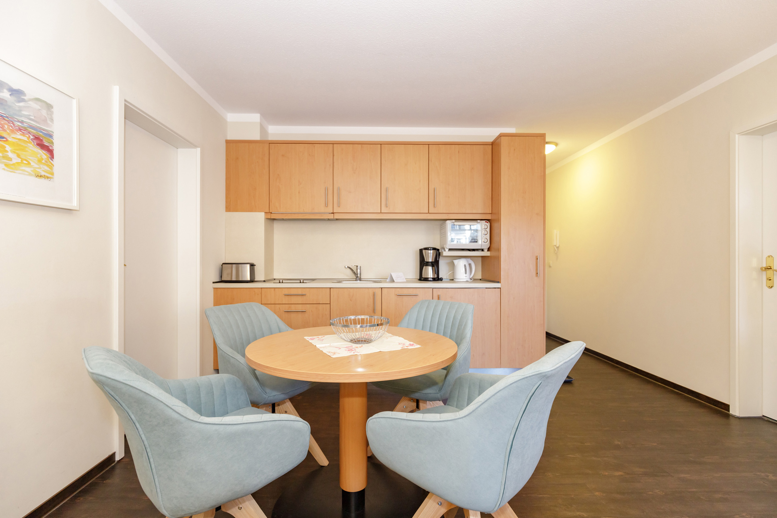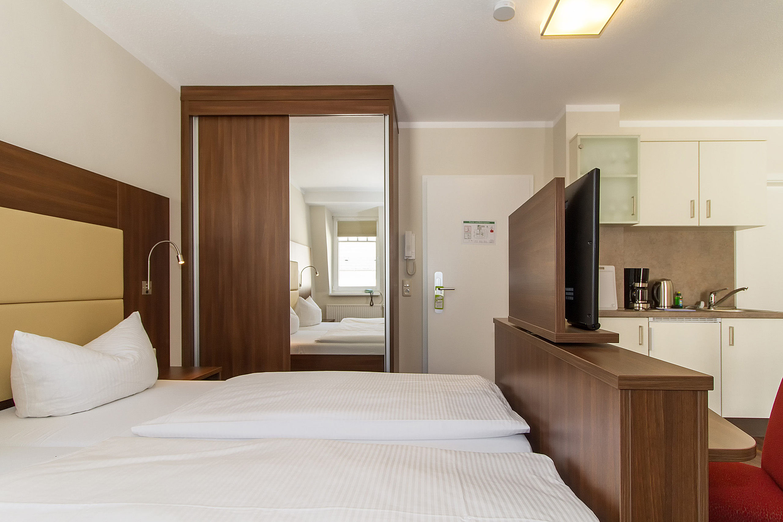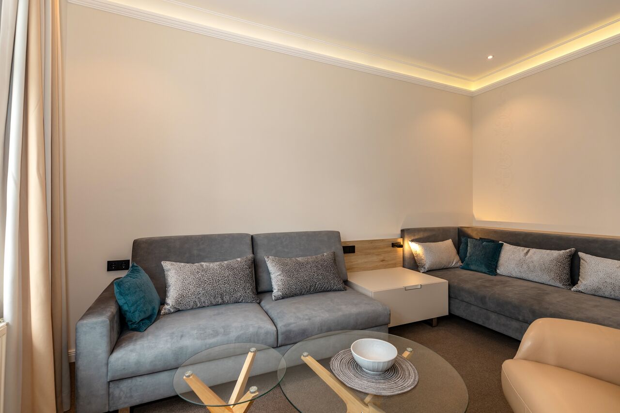 Unsere 1- und 2-Raum-Appartements verbinden die Unabhängigkeit einer Ferienwohnung mit dem Komfort eines Hotels: großzügiger Wohnraum, Küchenzeile mit Esstisch, Flachbildfernseher, Safe, Telefon, tägliche Reinigung und Frühstück im benachbarten Hotel inklusive.