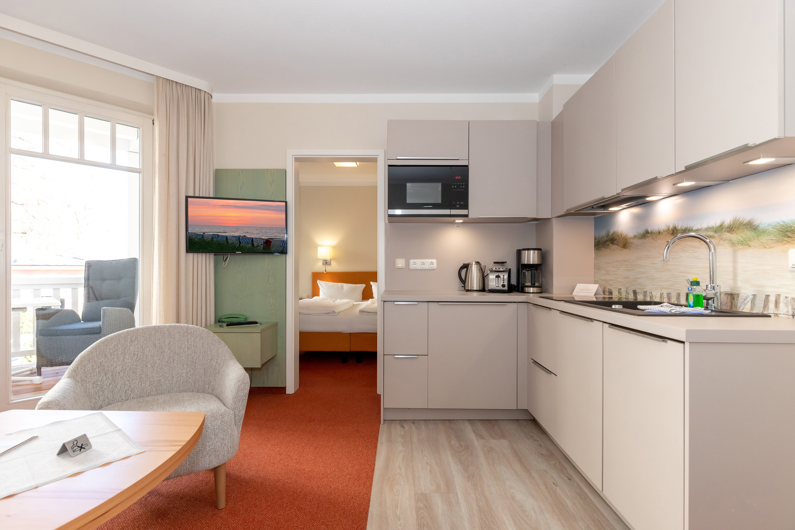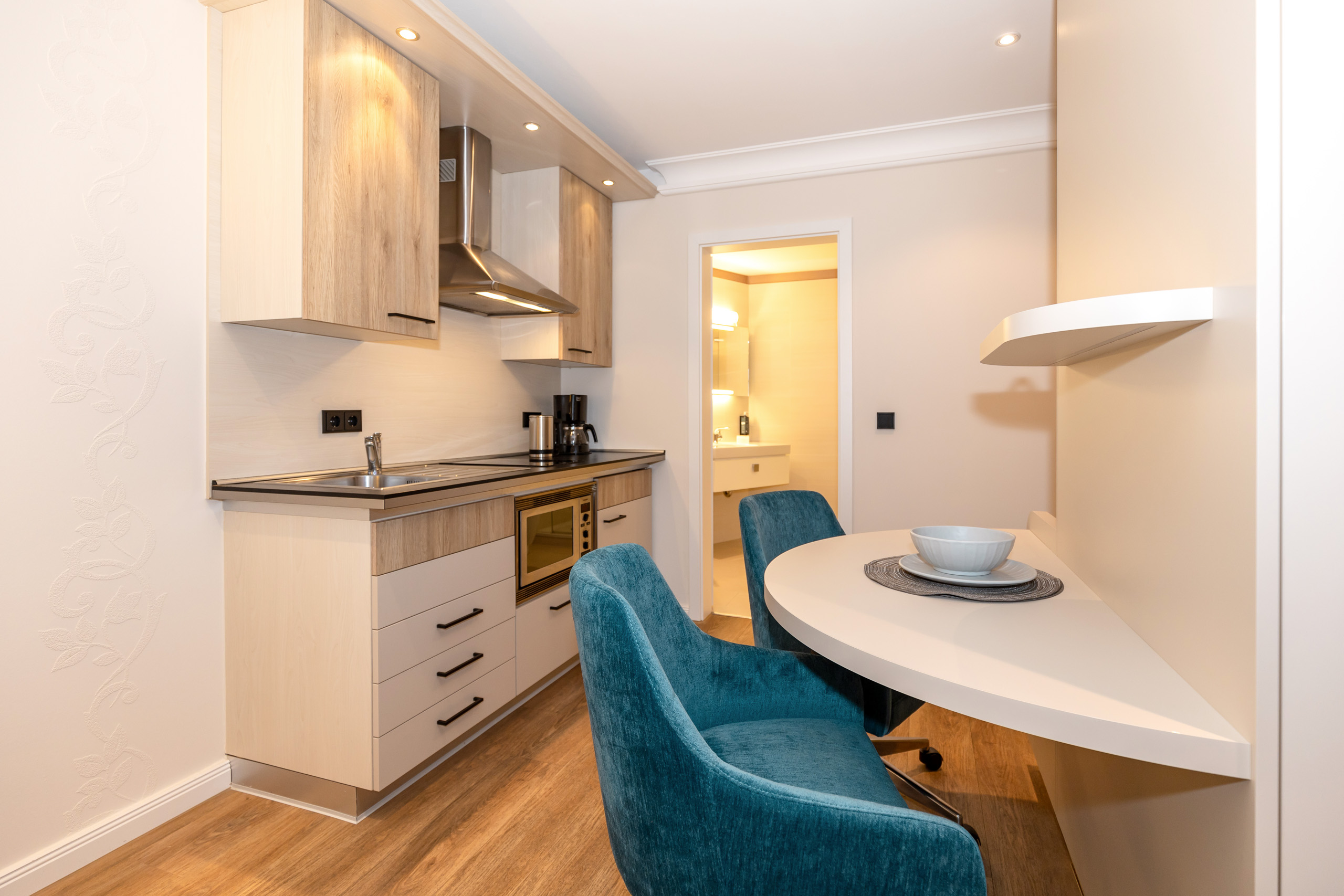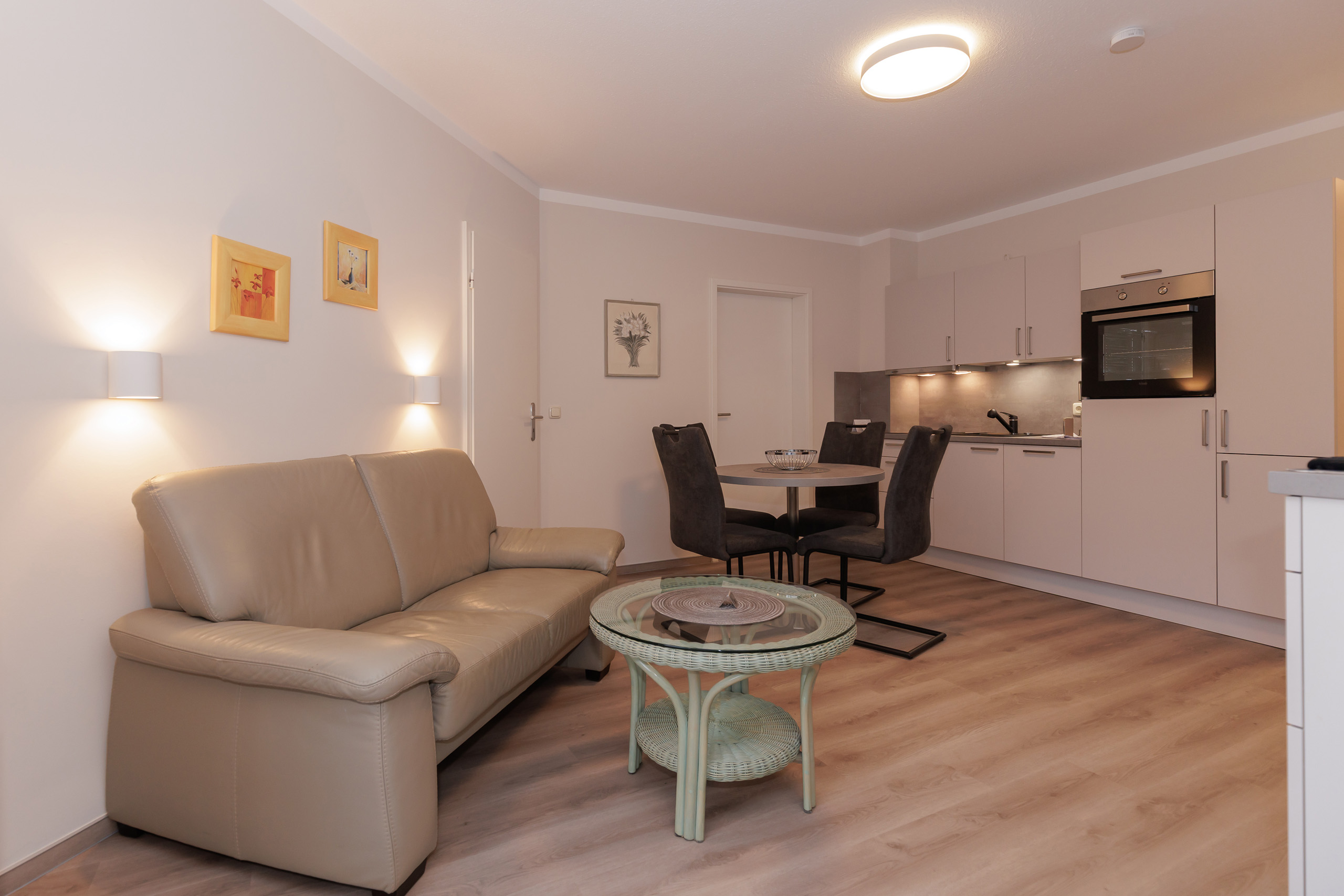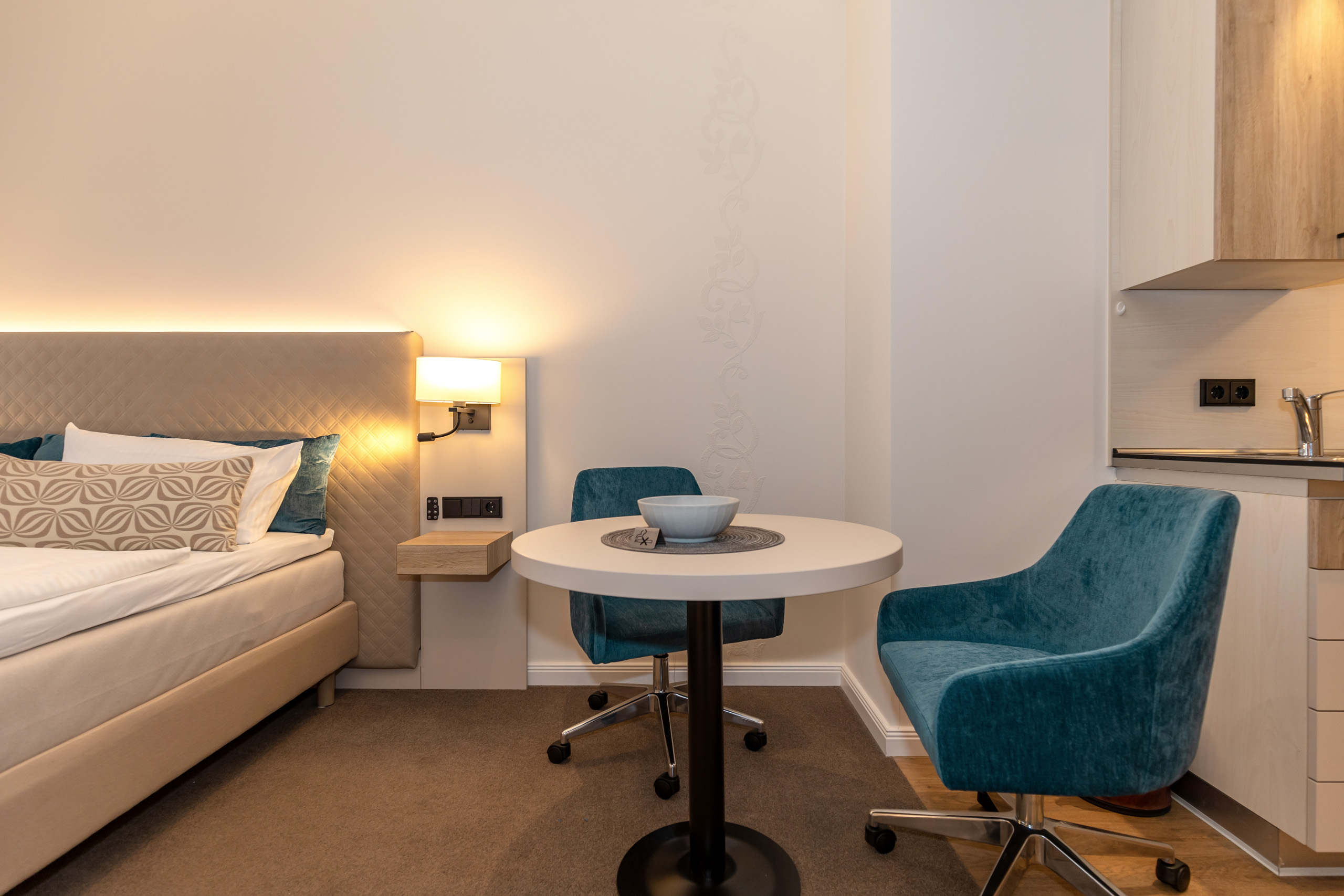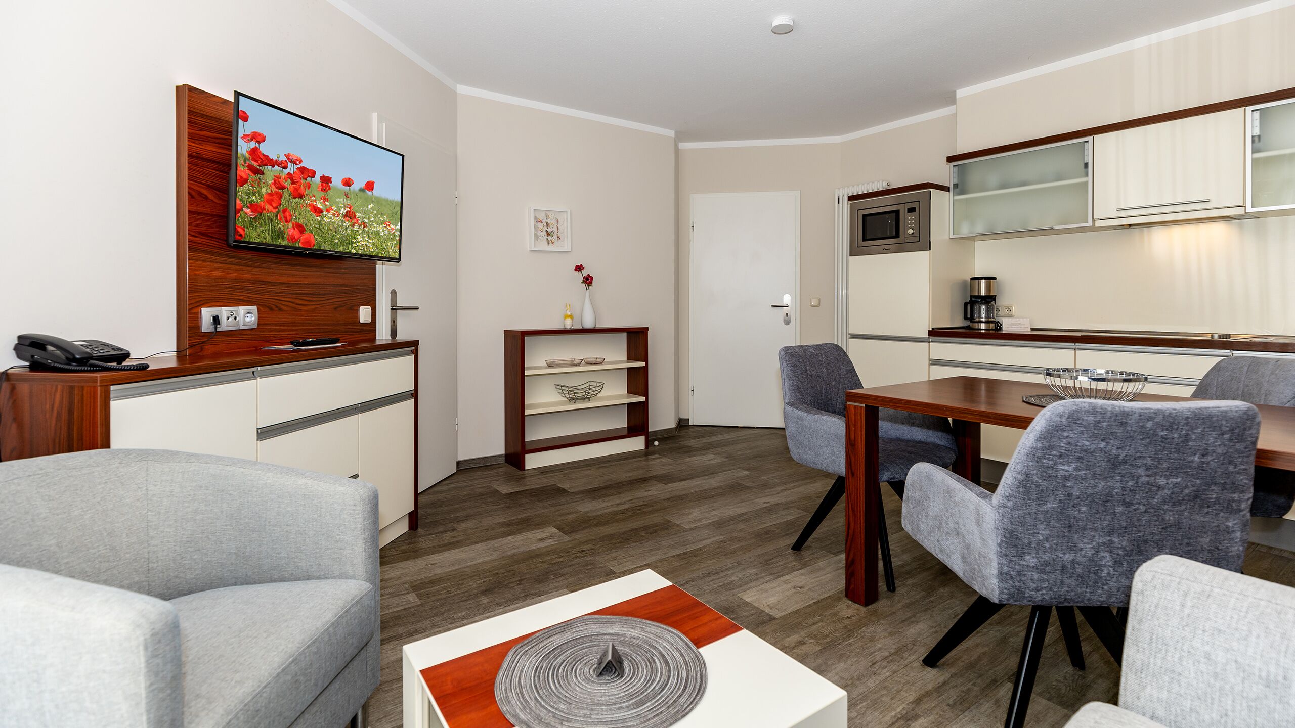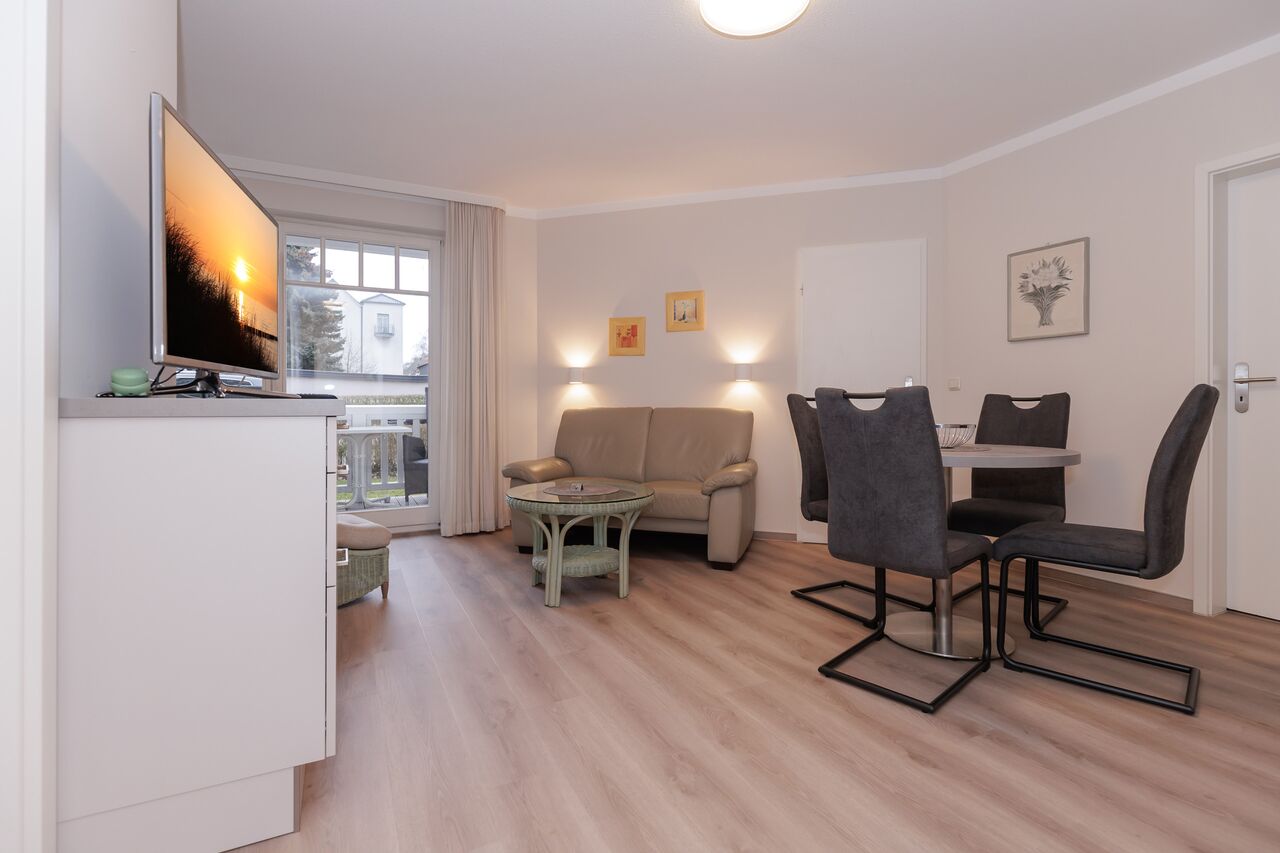 Unsere 1- und 2-Raum-Appartements verbinden die Unabhängigkeit einer Ferienwohnung mit dem Komfort eines Hotels: großzügiger Wohnraum, Küchenzeile mit Esstisch, Flachbildfernseher, Safe, Telefon, tägliche Reinigung und Frühstück im benachbarten Hotel inklusive.