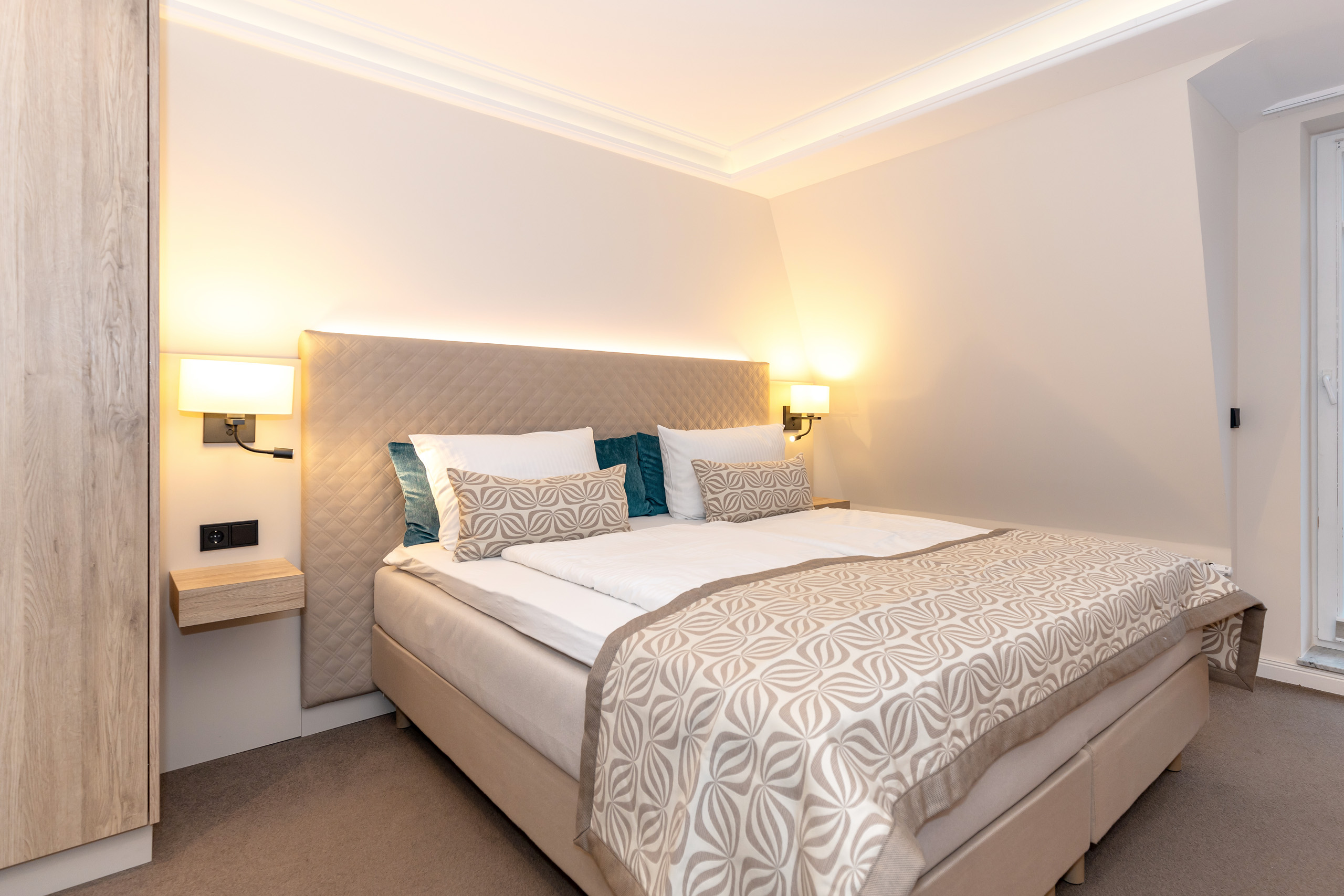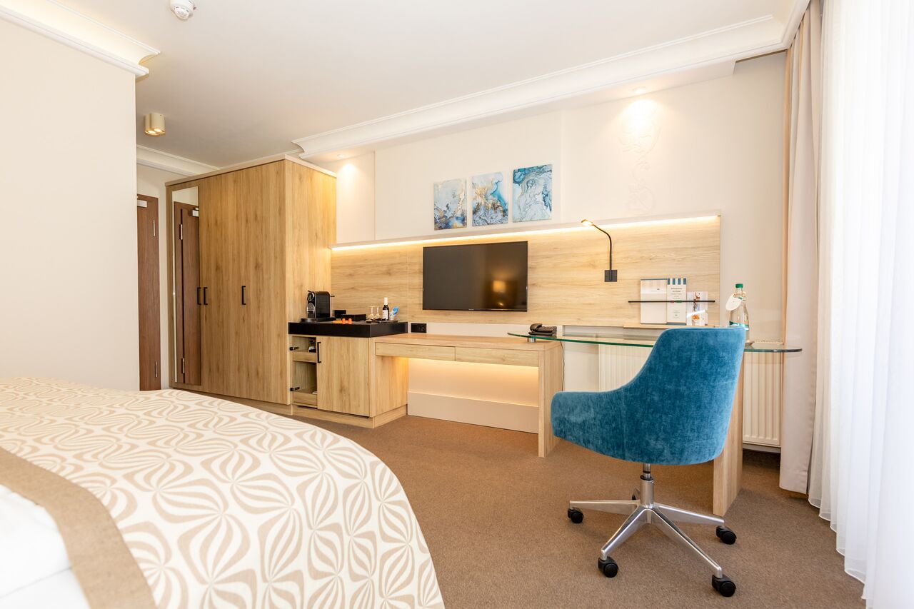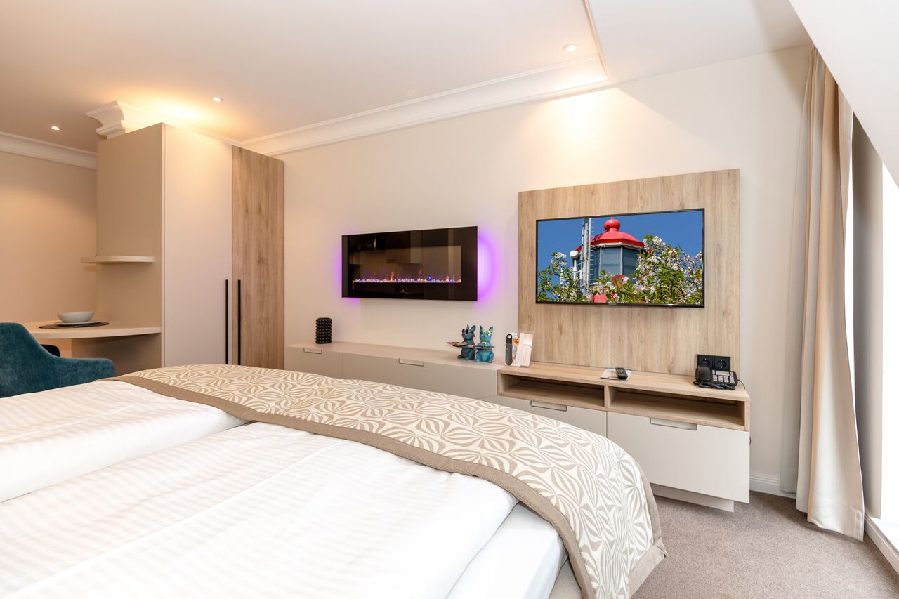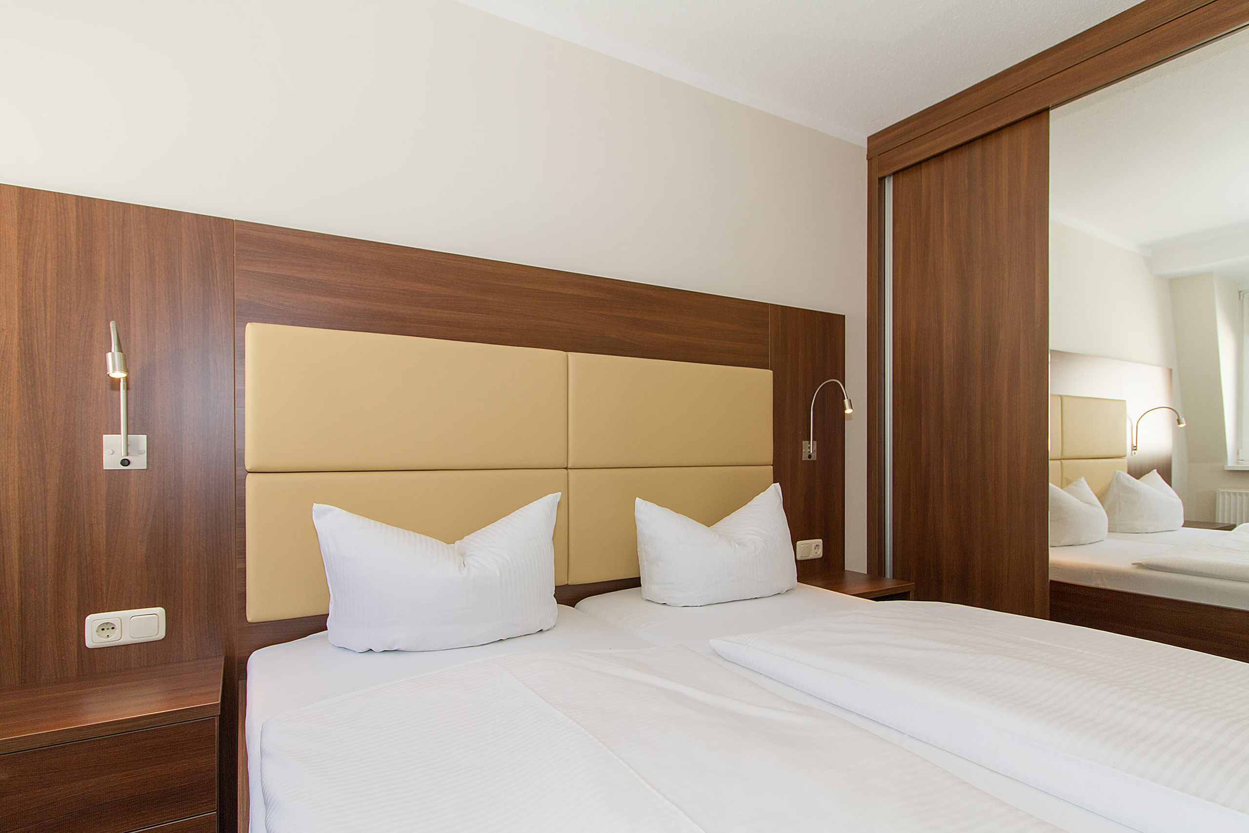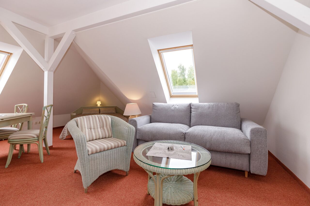 Unsere 1- und 2-Raum-Appartements verbinden die Unabhängigkeit einer Ferienwohnung mit dem Komfort eines Hotels: großzügiger Wohnraum, Küchenzeile mit Esstisch, Flachbildfernseher, Safe, Telefon, tägliche Reinigung und Frühstück im benachbarten Hotel inklusive.