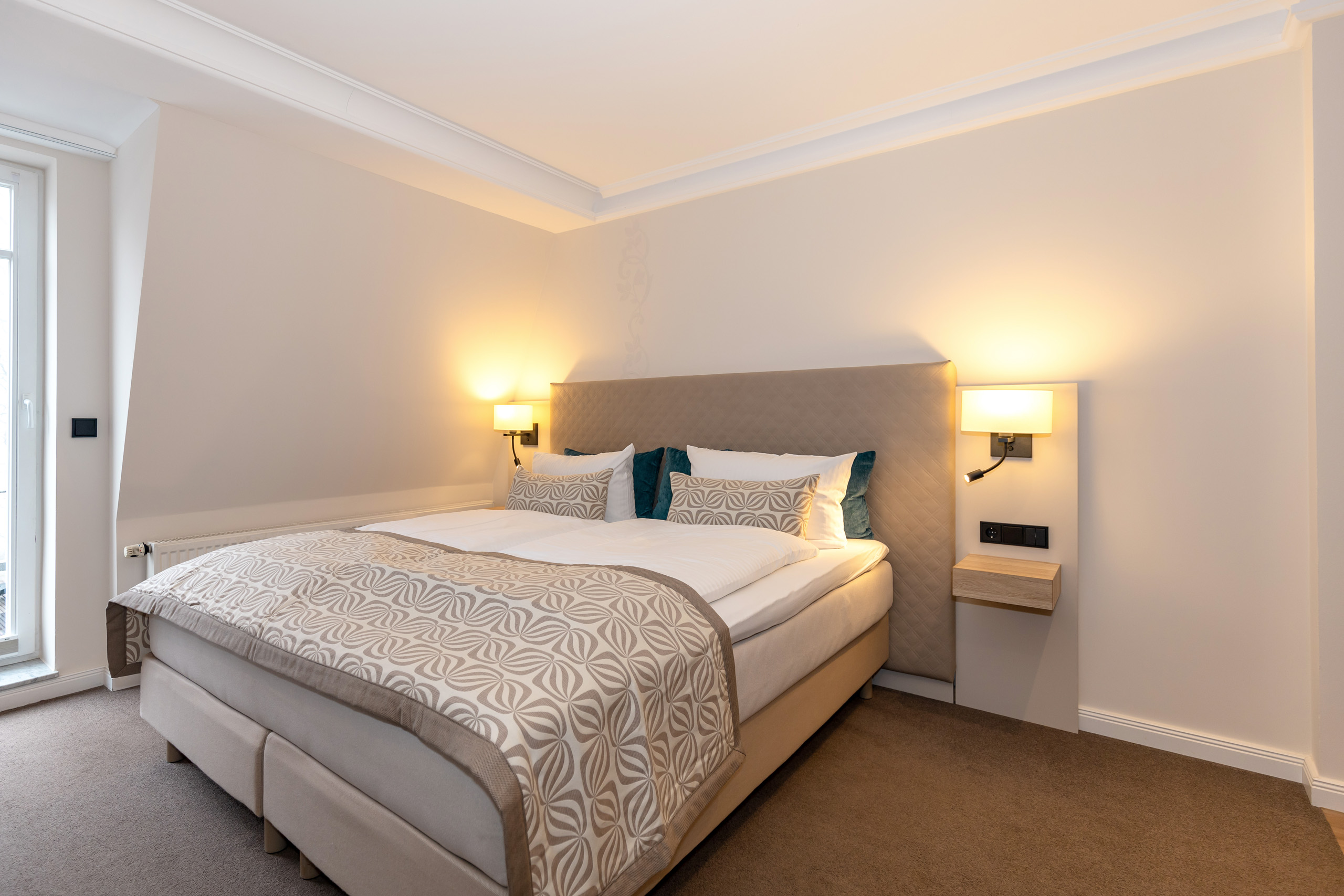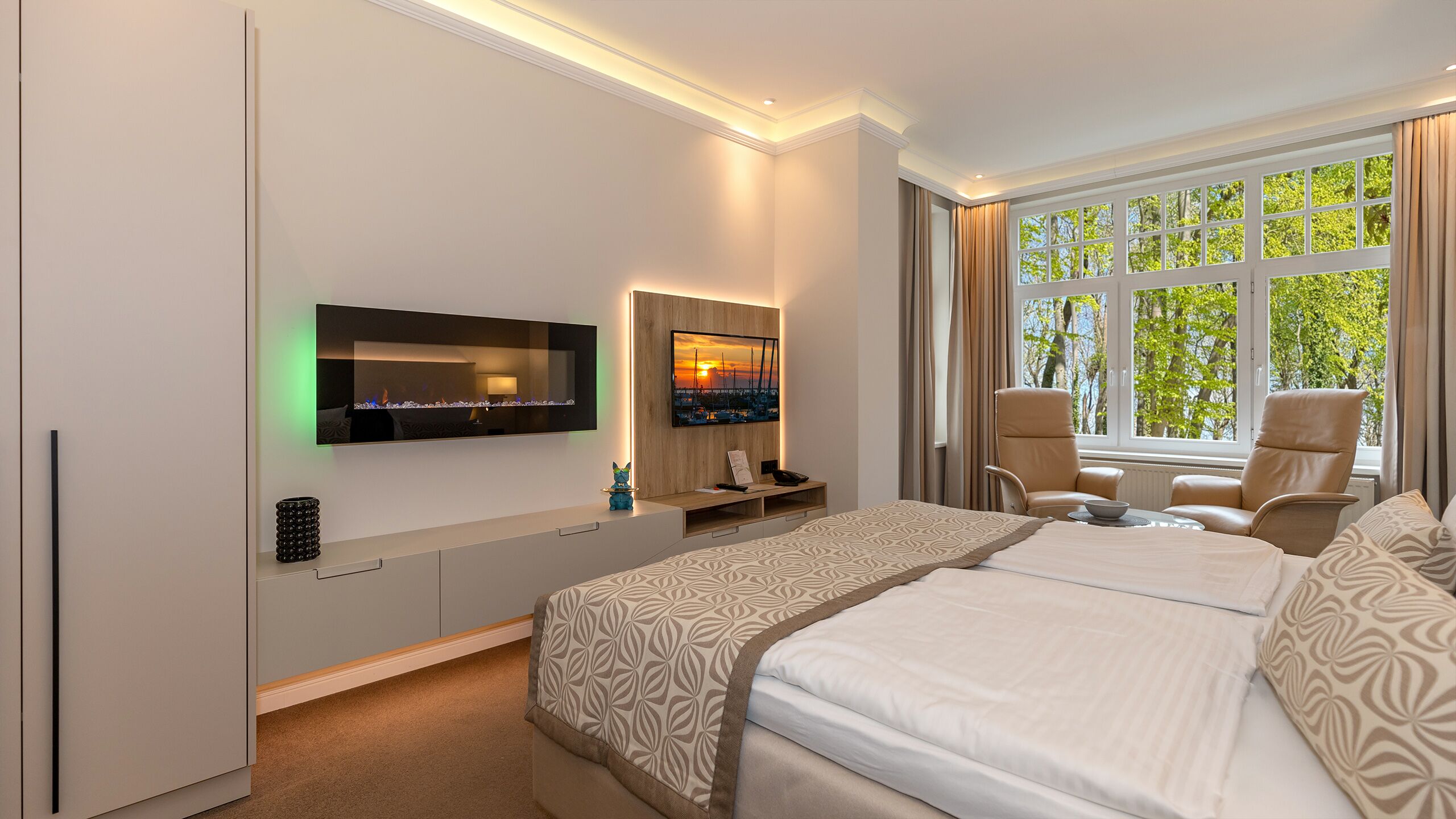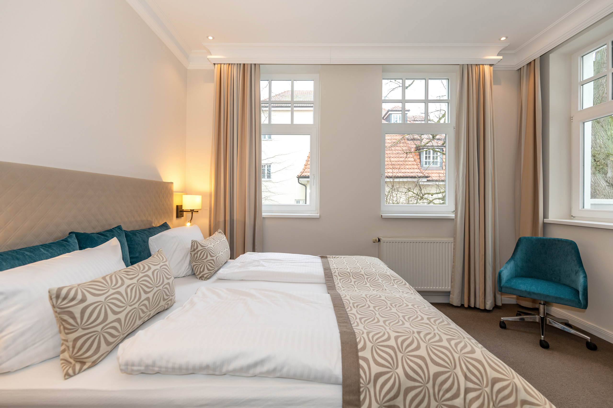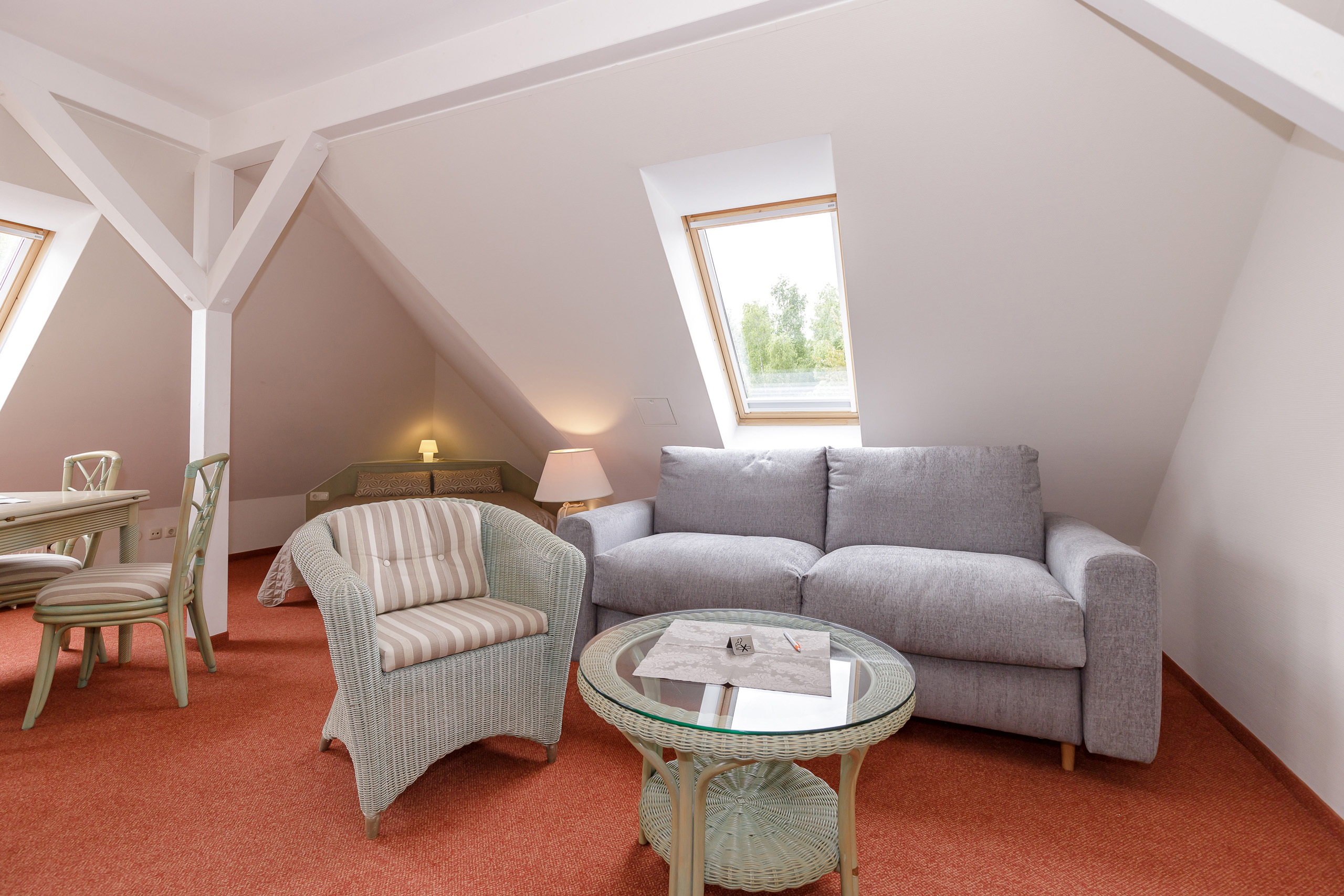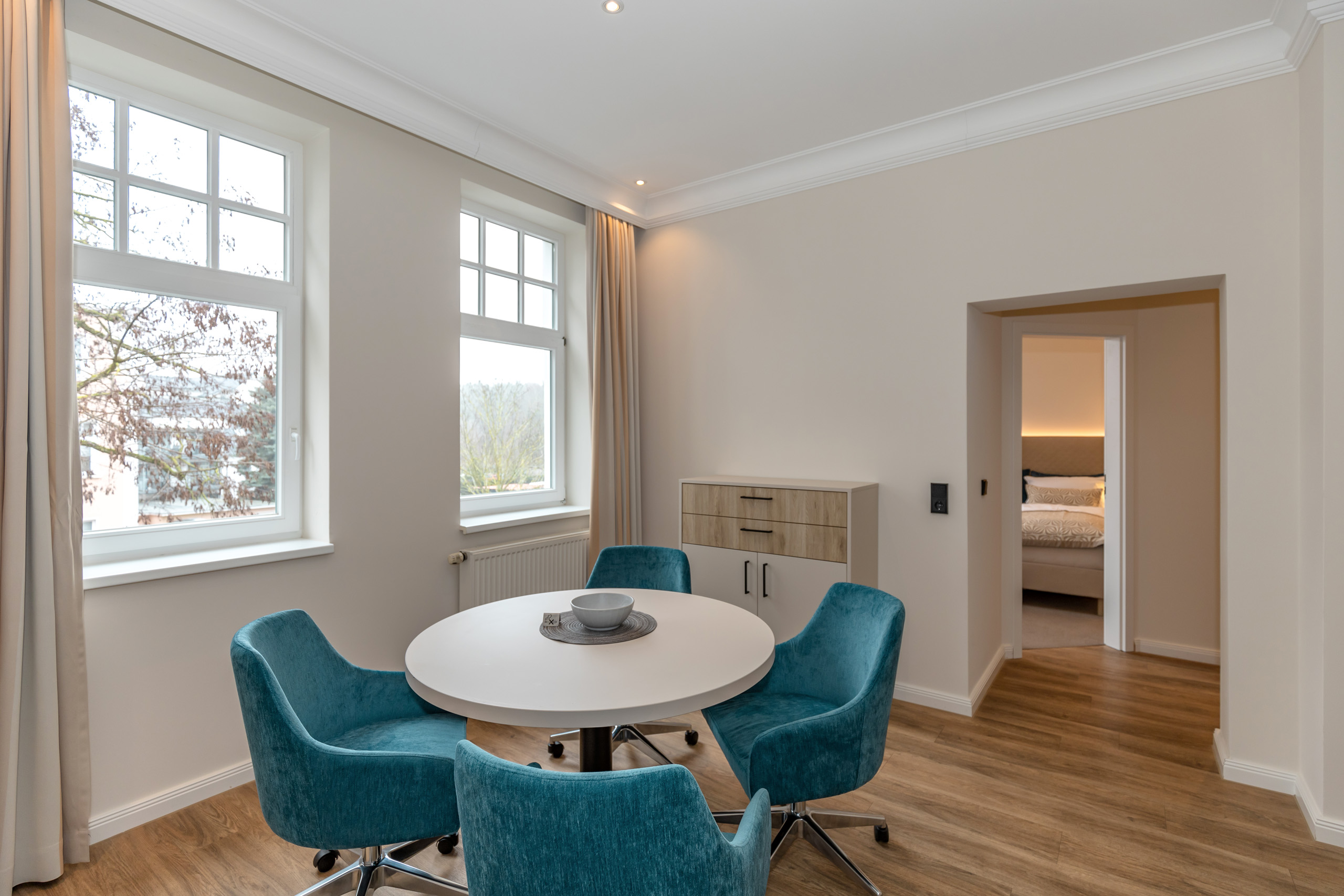 Unsere 1- und 2-Raum-Appartements verbinden die Unabhängigkeit einer Ferienwohnung mit dem Komfort eines Hotels: großzügiger Wohnraum, Küchenzeile mit Esstisch, Flachbildfernseher, Safe, Telefon, tägliche Reinigung und Frühstück im benachbarten Hotel inklusive.