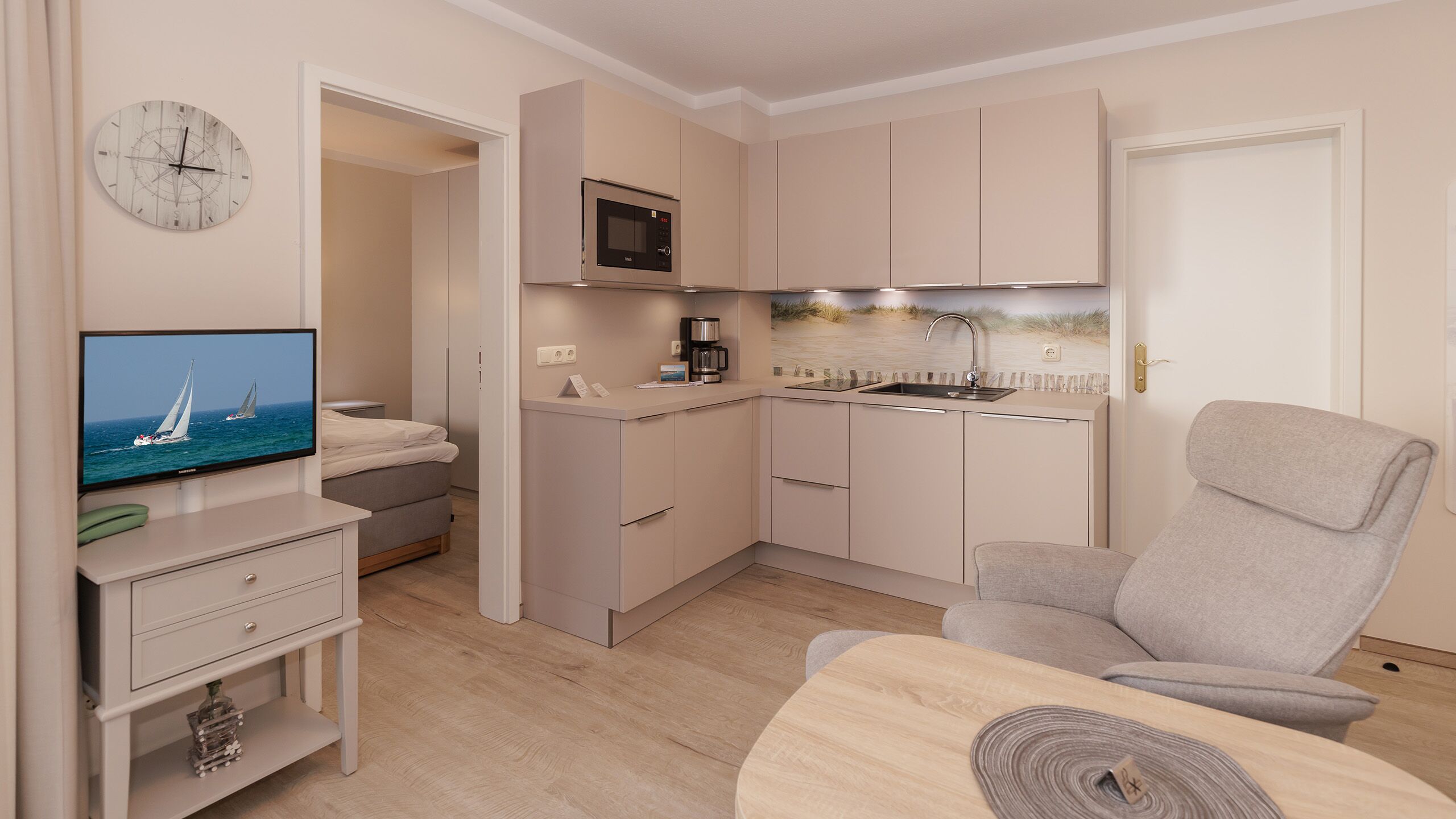 Die Ferienwohnungen für 2 bis 6 Personen verfügen über Küchenzeile, Wohnbereich, separate Schlafzimmer sowie Balkon oder Terrasse. Zusatzleistungen wie Frühstück oder die Nutzung des Wellness- und Saunabereichs im Hotel am Strand können nach Verfügbarkeit und gegen Aufpreis hinzugebucht werden. Das Hotel mit dem À-la-carte-Restaurant „Strandnah“ liegt nur 50 Meter entfernt.