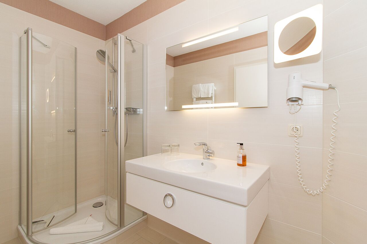 • Bad mit Dusche, Waschtisch, WC, kein Fenster
