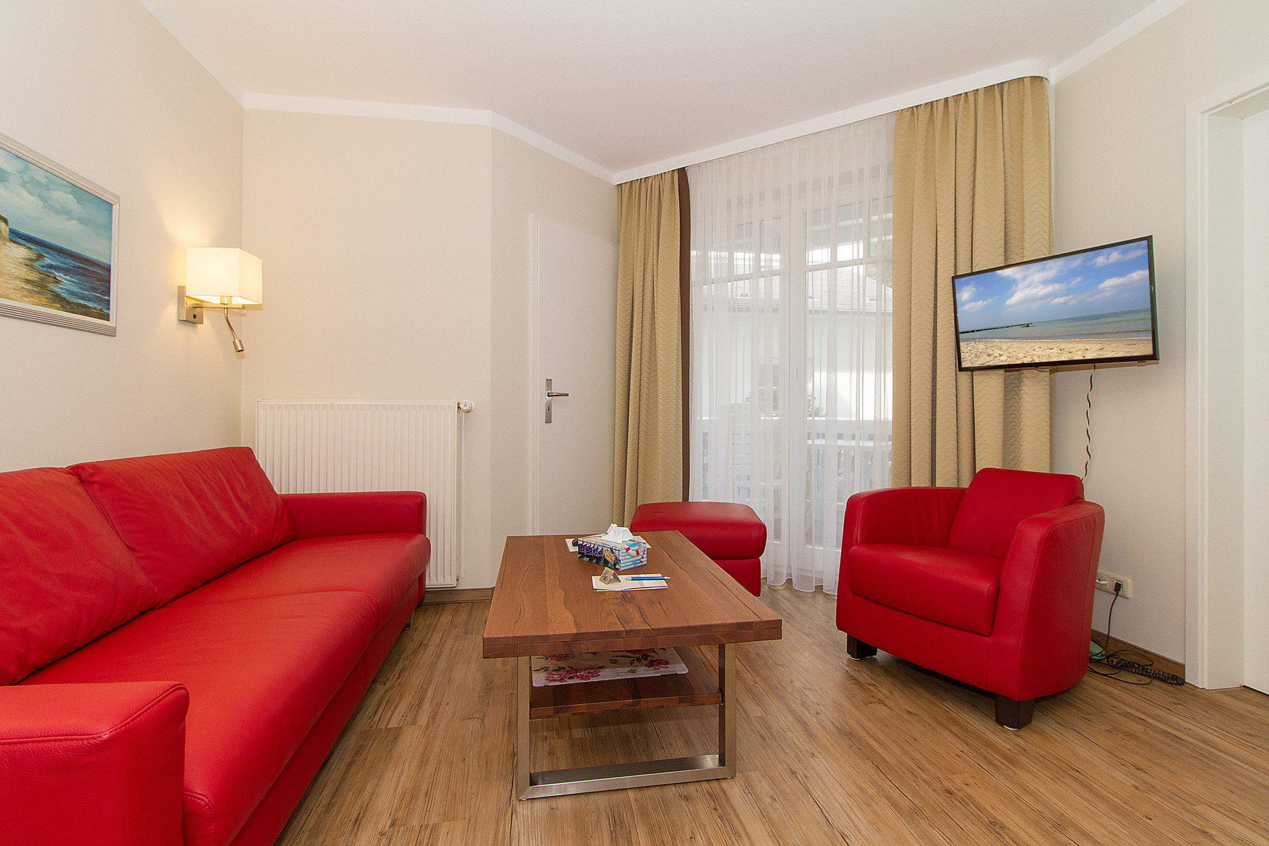 • aufgeteilt in Wohnzimmer mit Sofa und Couchtisch,