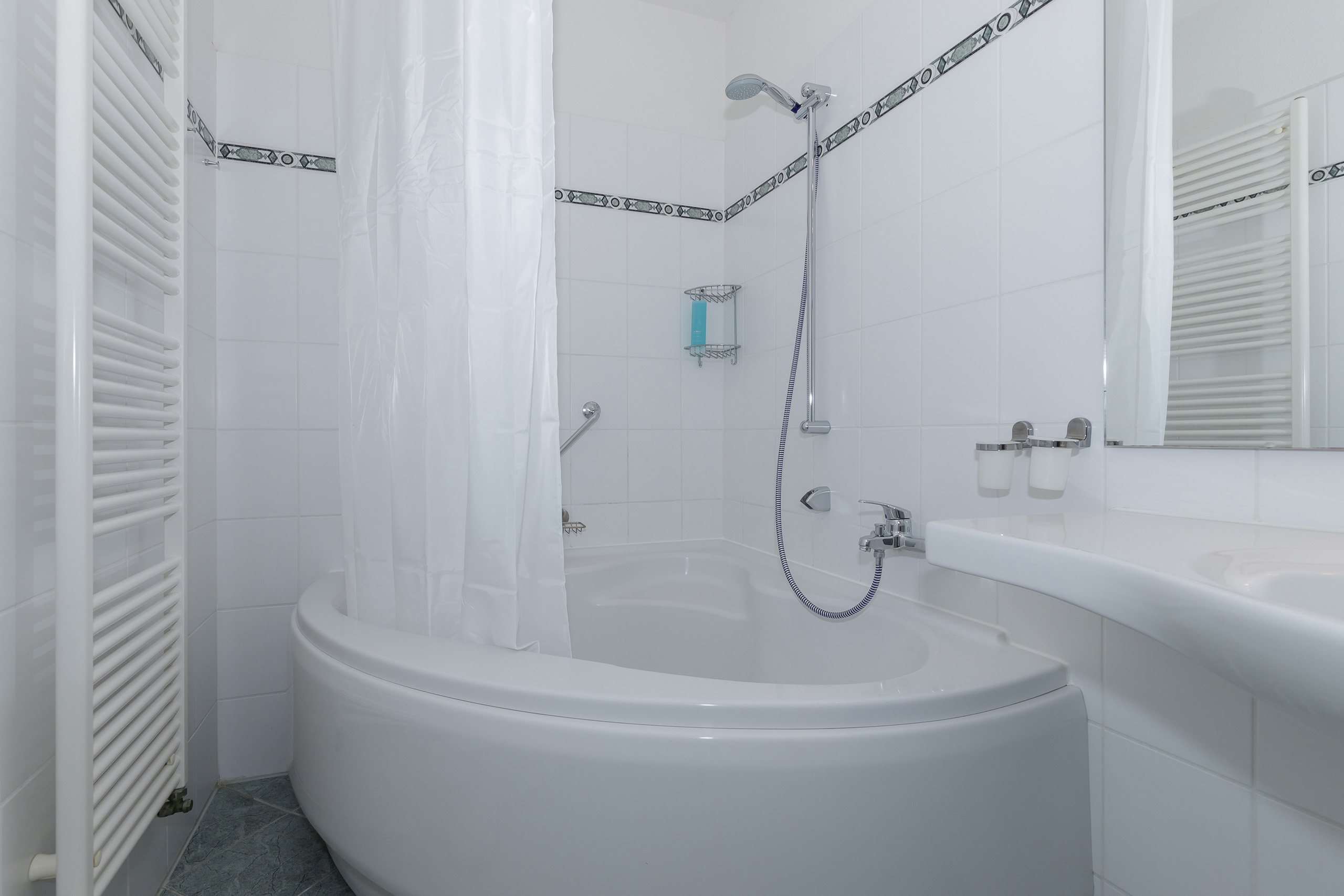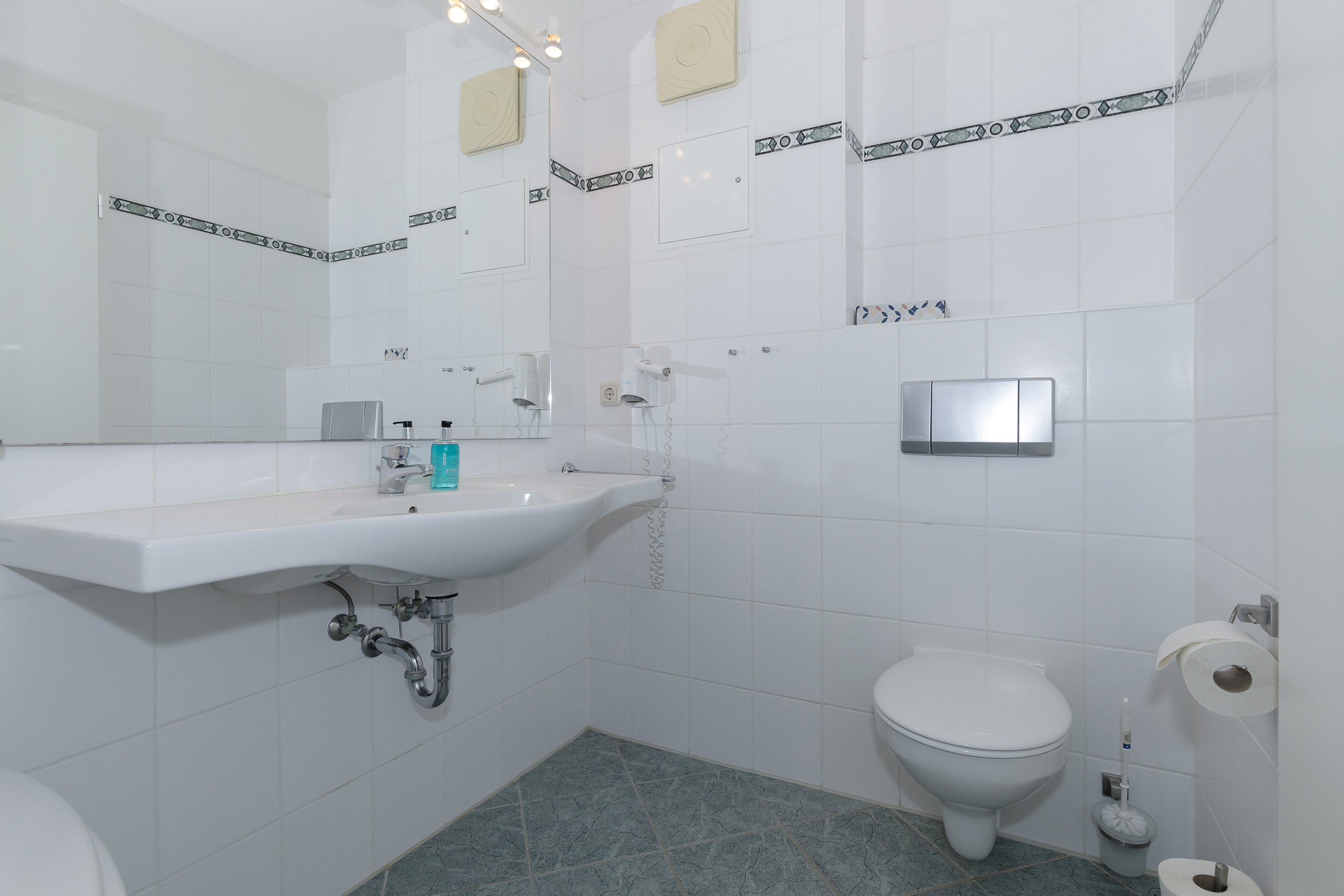 • Bad mit Badewanne, Waschtisch, WC, kein Fenster