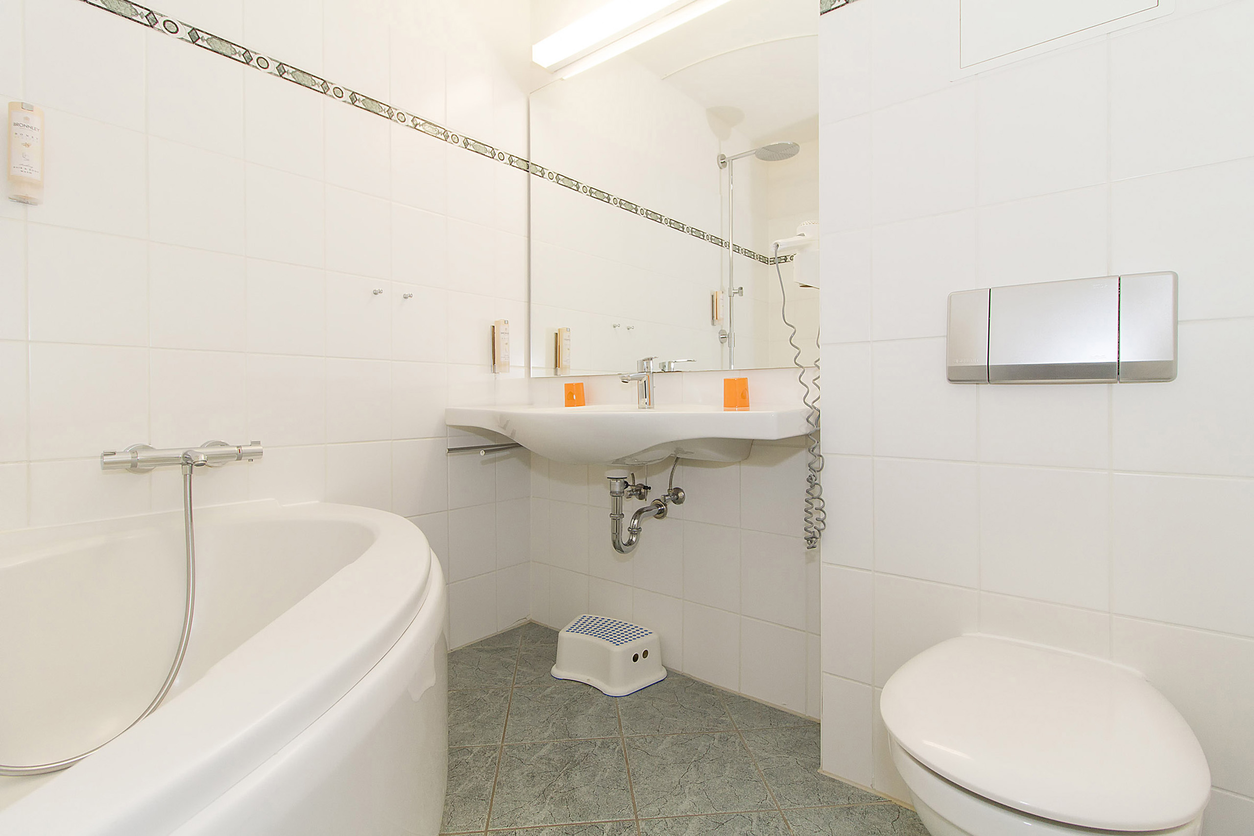 • Bad mit Badewanne, Waschtisch, WC, kein Fenster