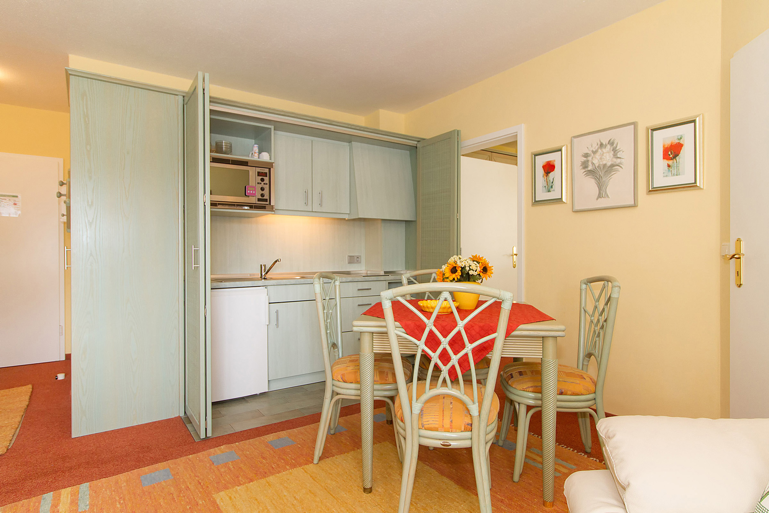 TV Gerät und Anrichte, angrenzende Küchenzeile, Esstisch mit 4 Stühlen