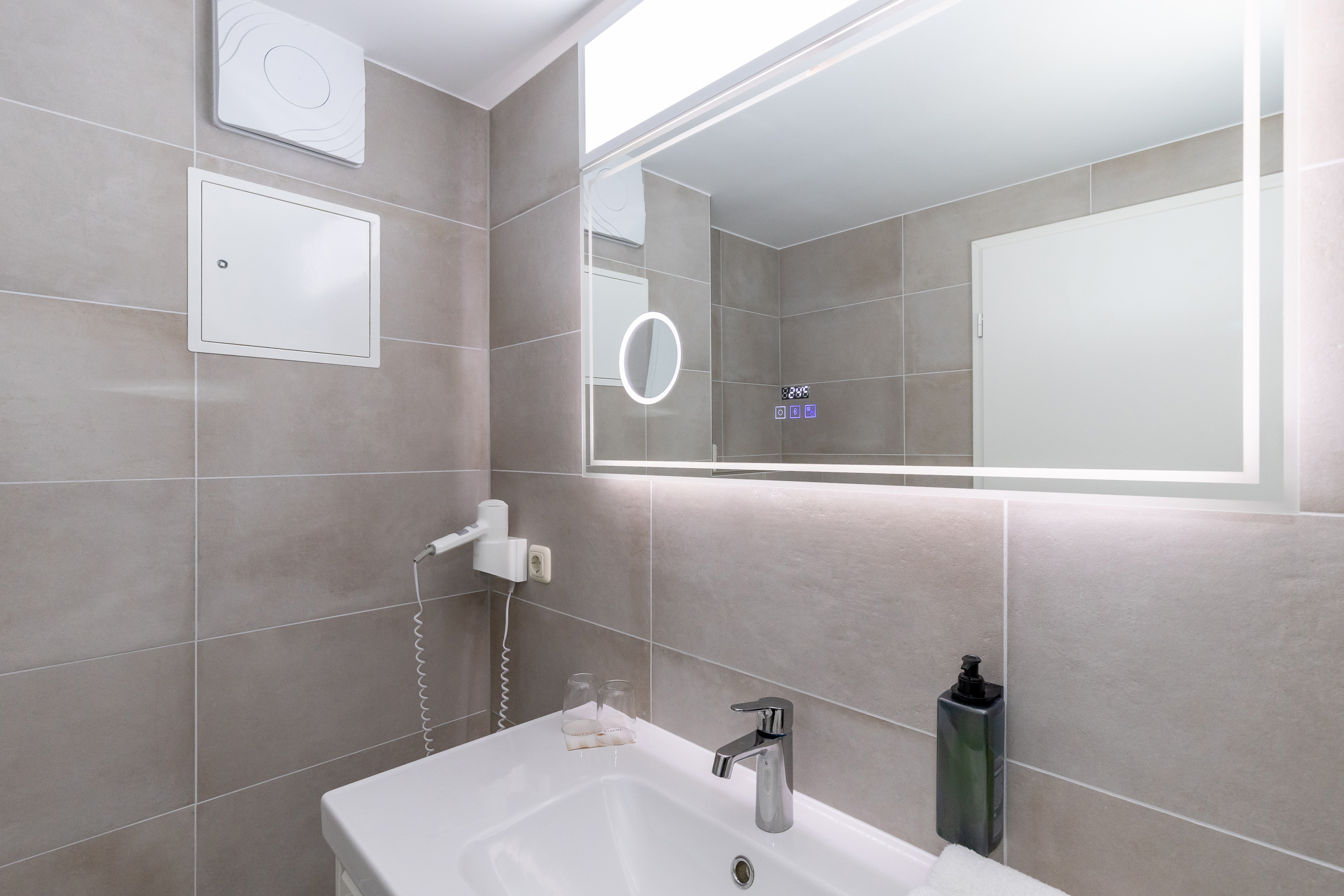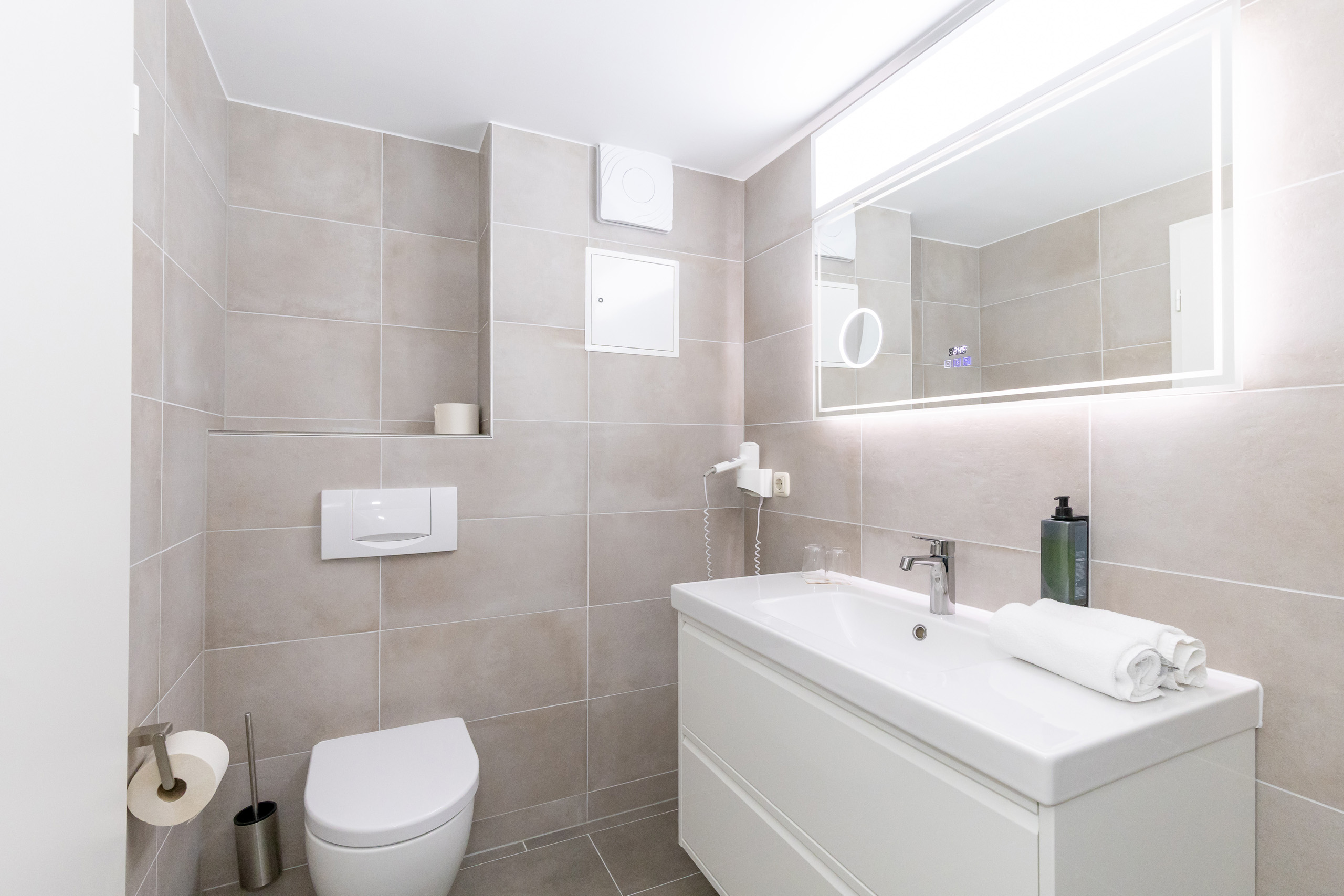 • Bad mit Dusche, Waschtisch, WC, kein Fenster