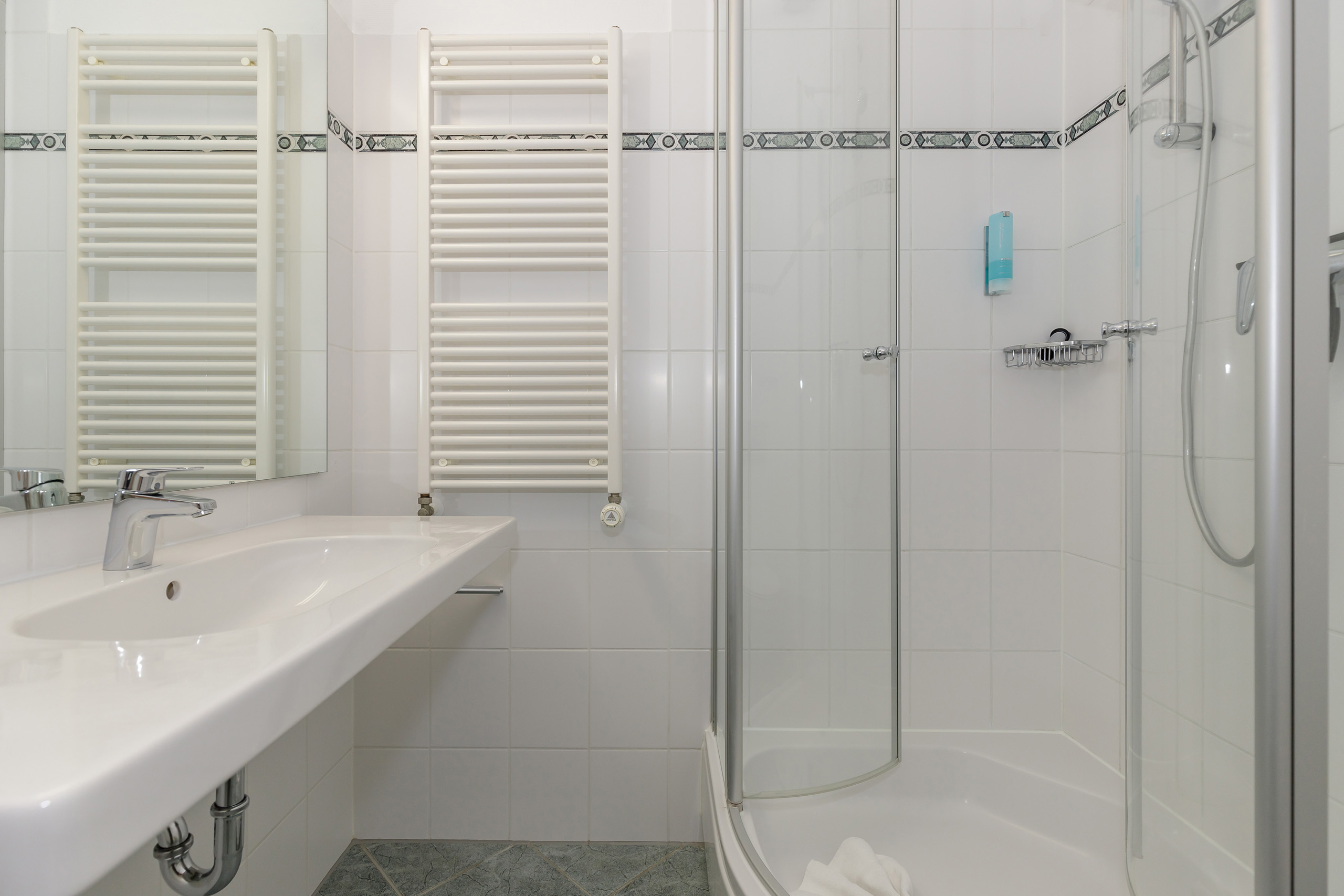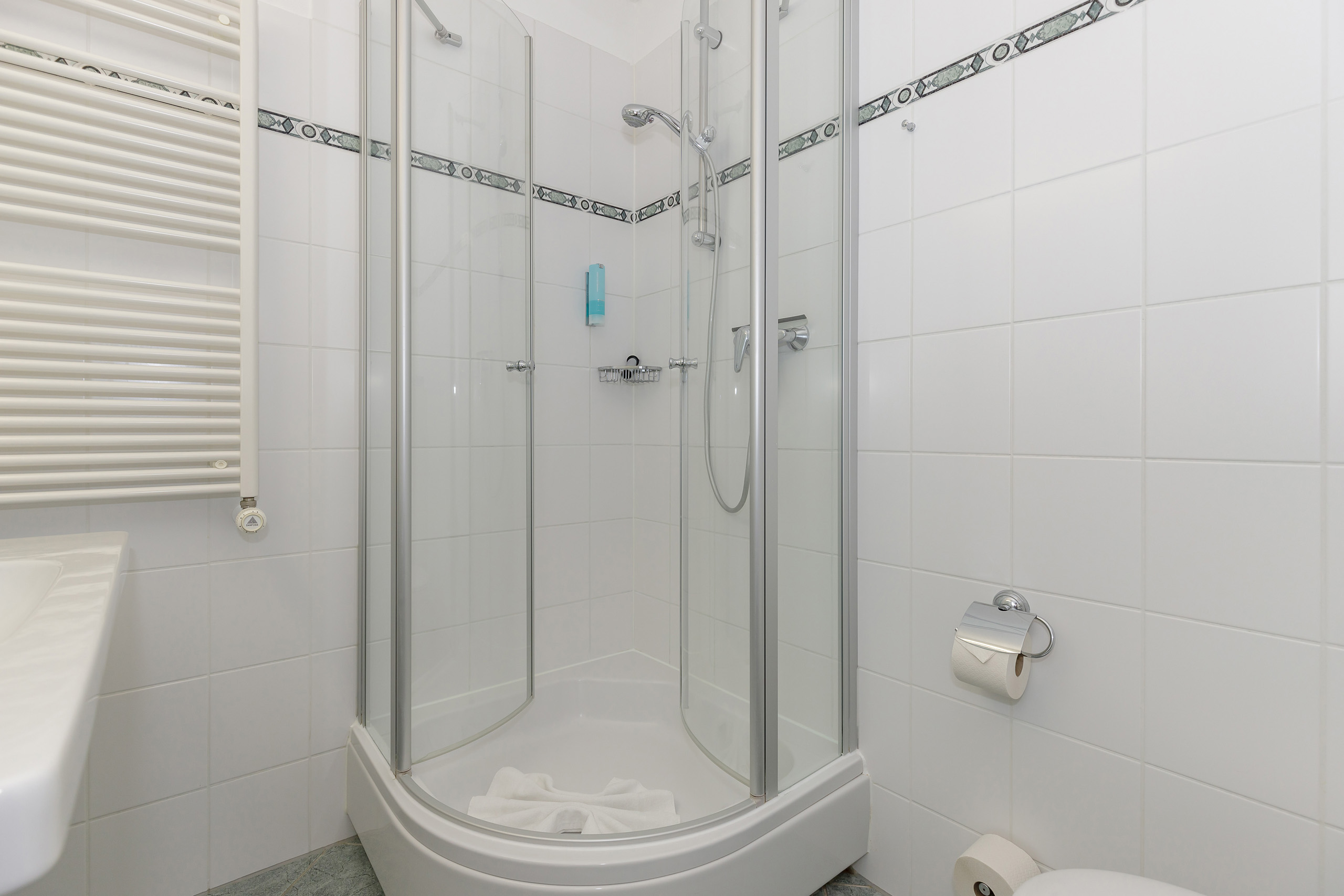 • Bad mit Dusche, Waschtisch, WC, kein Fenster